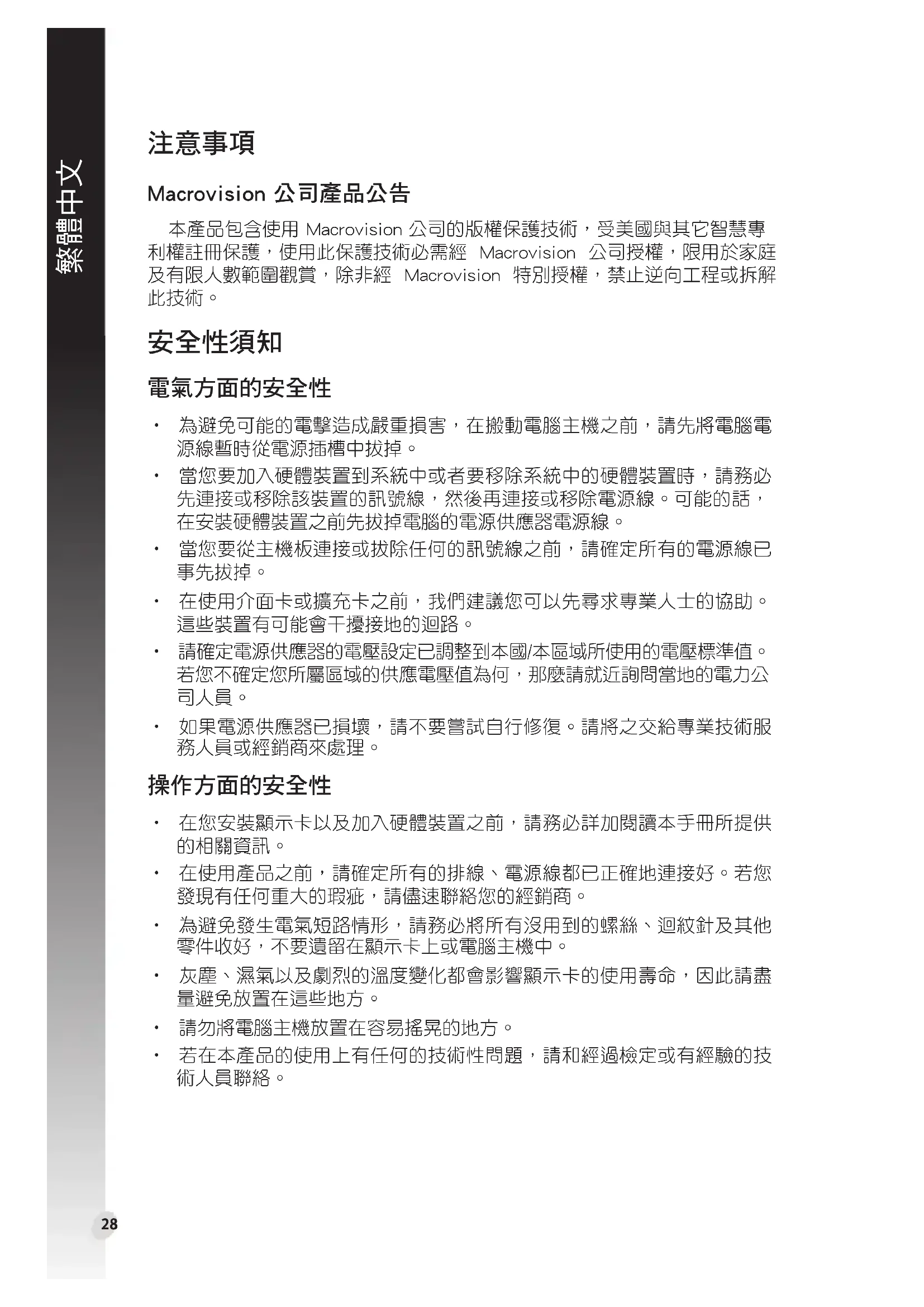 警告:提醒您在進行某一項工作時要注意您本身的安全。 小心: 提醒您在進行某一項工作時要注意勿傷害到電腦顯卡元