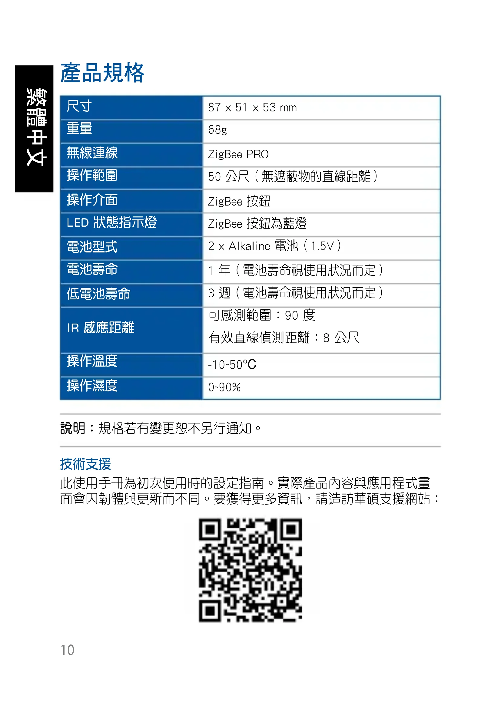 IR 動作感應器 可通過 IR 科技偵測動作。此設備的偵測範圍為 ±90 度, 平放有效偵測距離為 8 公尺。 ZigBee 按鈕 按下以與智慧管家連線。按住約 5 秒以重置設備。 說明:請確認重置華碩智慧家庭設備並將設備從專屬應用
