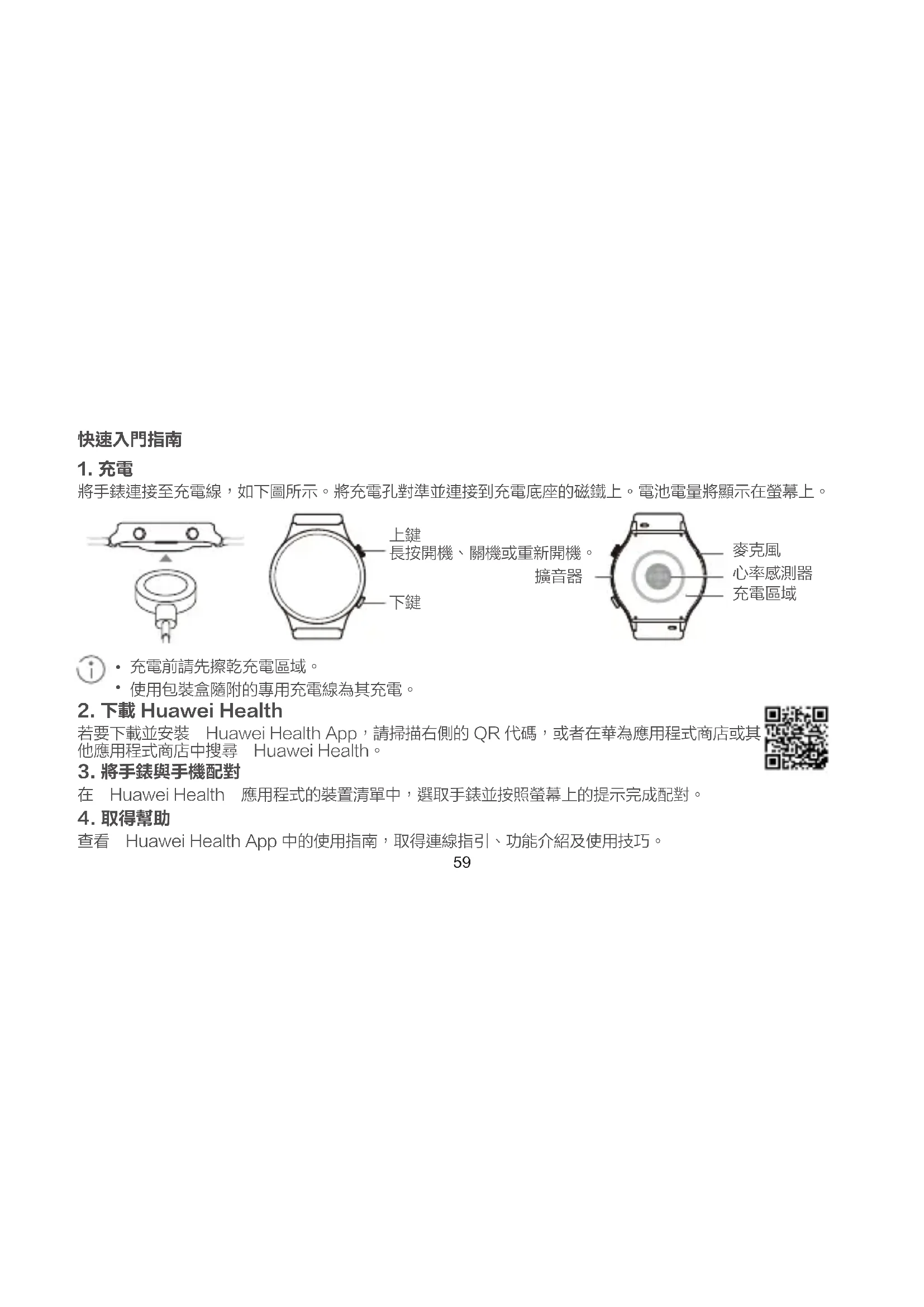 本產品非醫療器械,所提供的健康資料及建議僅供參考,不可作為診斷和治療的依據。充電底座不防水,充 電時請保持底座連接埠、金屬觸點及裝置等乾燥。由於個人體質差異,若佩戴時感到皮膚不適,請停止佩戴 並諮詢醫生。為保護聽力,建議使用音樂或通話等功能所需的最小音量,以免損傷聽力或造成其他不良影響。65