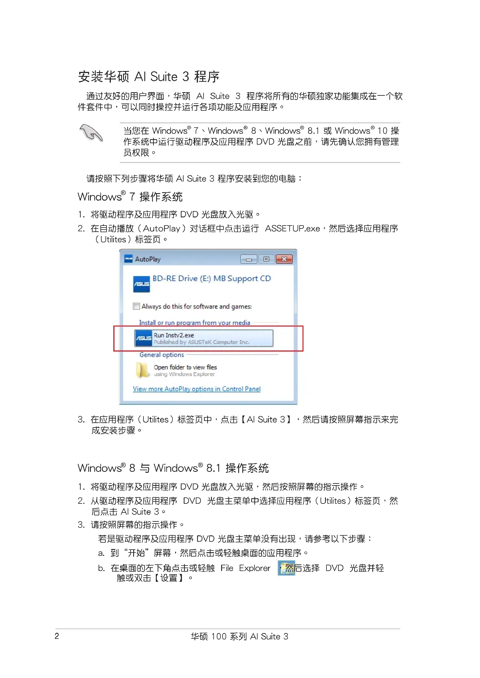 若是驅動程序及應用程序 DVD 光盤主菜單沒有出現,請參考以下步驟: a. 到“開始”屏幕,然後點擊或輕觸桌面的應用程序。 b. 在桌面的左下角點擊或輕觸 File Explorer ,然後選擇 DVD 光盤並輕 觸或雙擊【設置】。華碩 100 系列 AI Suite 3