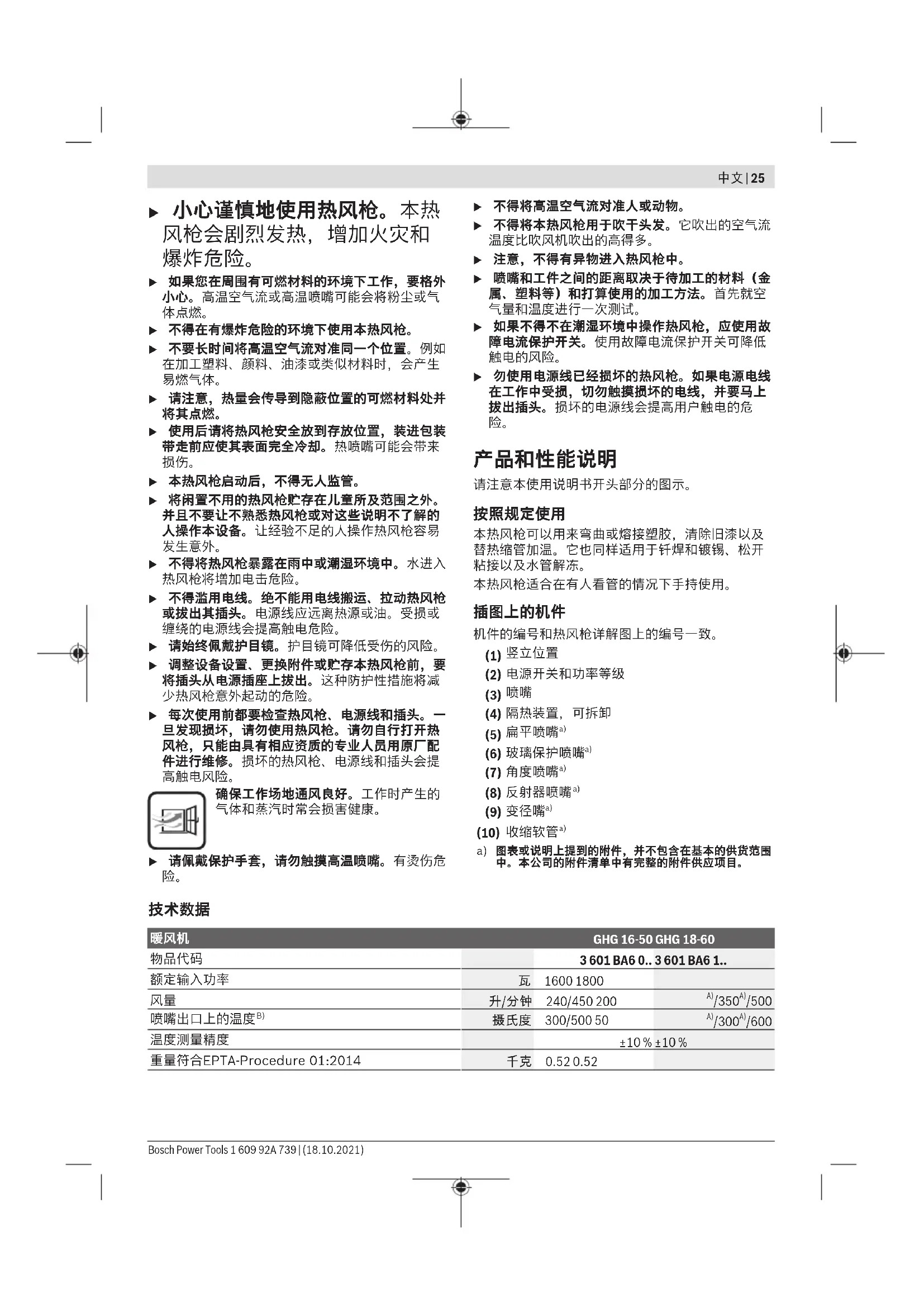 1 609 92A 739 | (18.10.2021) Bosch Power Tools中文 | 25 u 小心谨慎地使用热风枪。本热 风枪会剧烈发热,增加火灾和