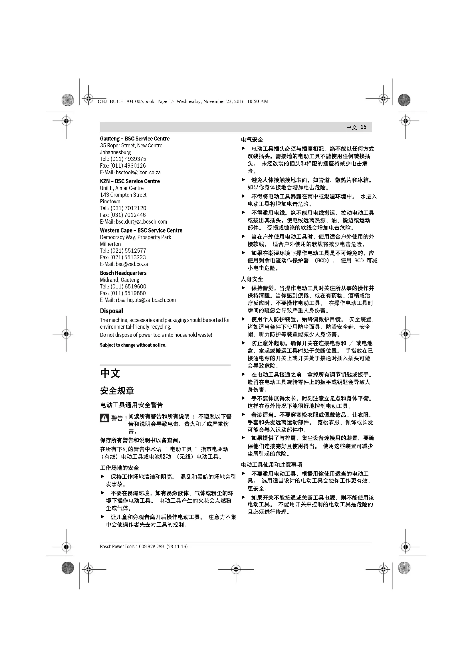 閱讀所有警告和所有說明。 不遵照以下警告和說明會導致電擊、著火和/或嚴重傷 保存所有警告和說明書以備查閱。在所有下列的警告中術語 " 電動工具 " 指市電驅動(有線)電動工具或電池驅動 (無線)電動工具。 OBJ_BUCH-704-005.book Page 22 Wednesday, November 23, 2016 10:50 AM中文 | 23 Bosch Power Tools 1 609 92A 2V9 | (23.11.16)
