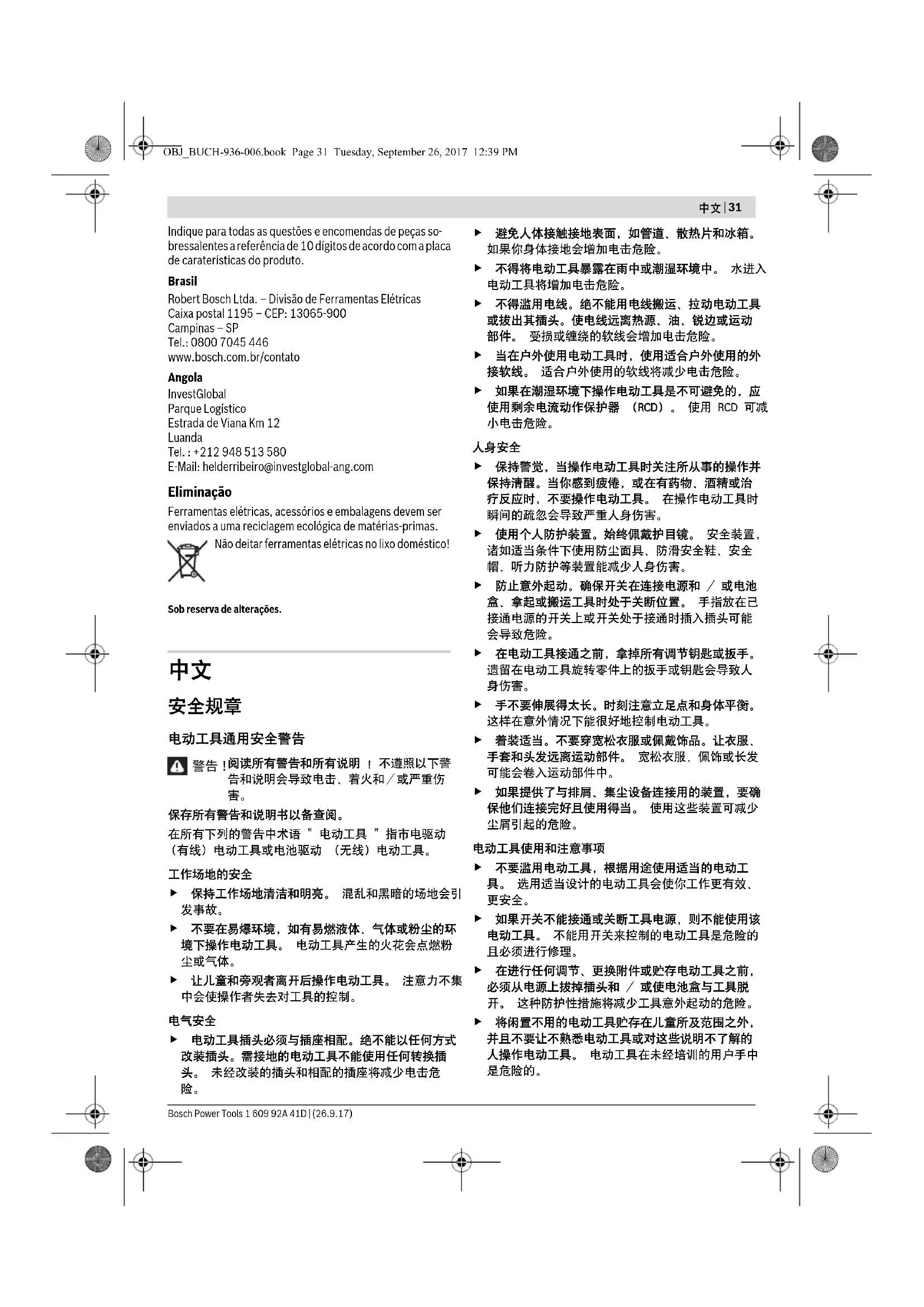 OBJ_BUCH-936-006.book Page 35 Tuesday, September 26, 2017 12:39 PM36 | 中文 1 609 92A 41D | (26.9.17) Bosch Power Tools 博世电动工具 (中国)有限公司中国 浙江省 杭州市滨江区滨康路 567 号邮政编码:310052免费服务热线: 4008268484传真:(0571) 87774502电邮:contact.ptcn@cn.bosch.comwww.bosch-pt.com.cn羅伯特 · 博世有限公司香港北角英皇道 625 號 21 樓客戶服務熱線:+852 2101 0235傳真:+852 2590 9762電郵:info@hk.bosch.com網站:www.bosch-pt.com.hk制造商地址:Robert Bosch Power Tools GmbH罗伯特 · 博世电动工具有限公司70538 Stuttgart / GERMANY70538 斯图加特 / 德国 必须以符合环保的方式,回收再利用损坏的机器、附件和废弃的包装材料。不可以把电动工具丢入家庭垃圾中 !保留修改权。