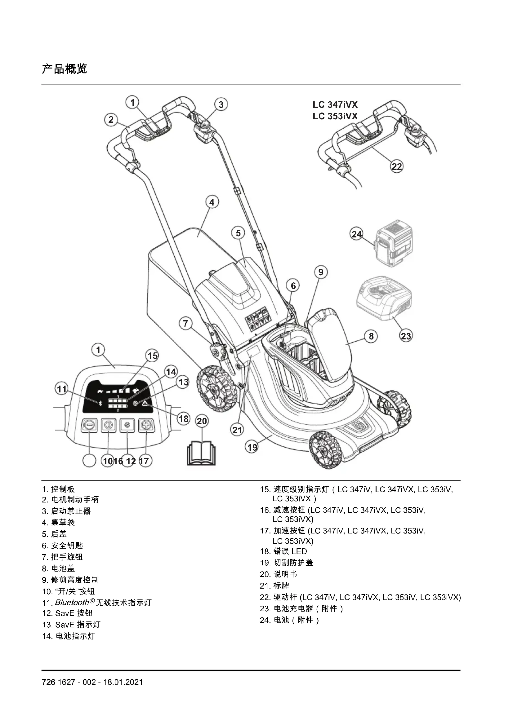 使用产品修剪草坪。切勿将产品用于其他任务。 1627 - 002 - 18.01.2021 725产品概览