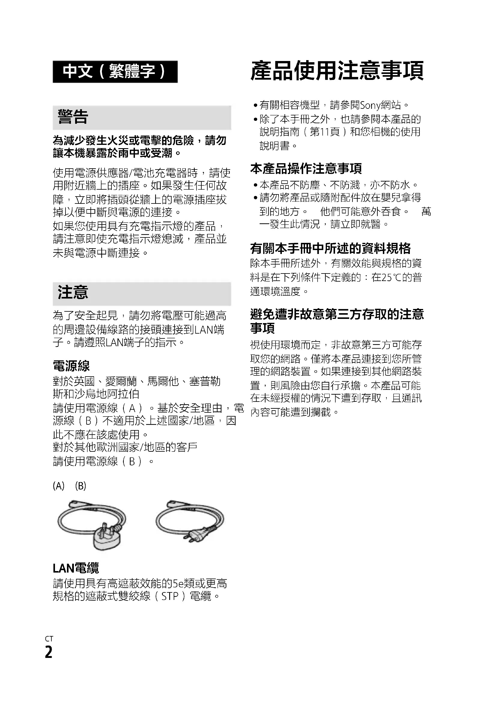 視使用環境而定,非故意第三方可能存取您的網路。僅將本產品連接到您所管理的網路裝置。如果連接到其他網路裝置,則風險由您自行承擔。本產品可能在未經授權的情況下遭到存取,且通訊內容可能遭到攔截。CCB-WD1 4-735-433-21(1)