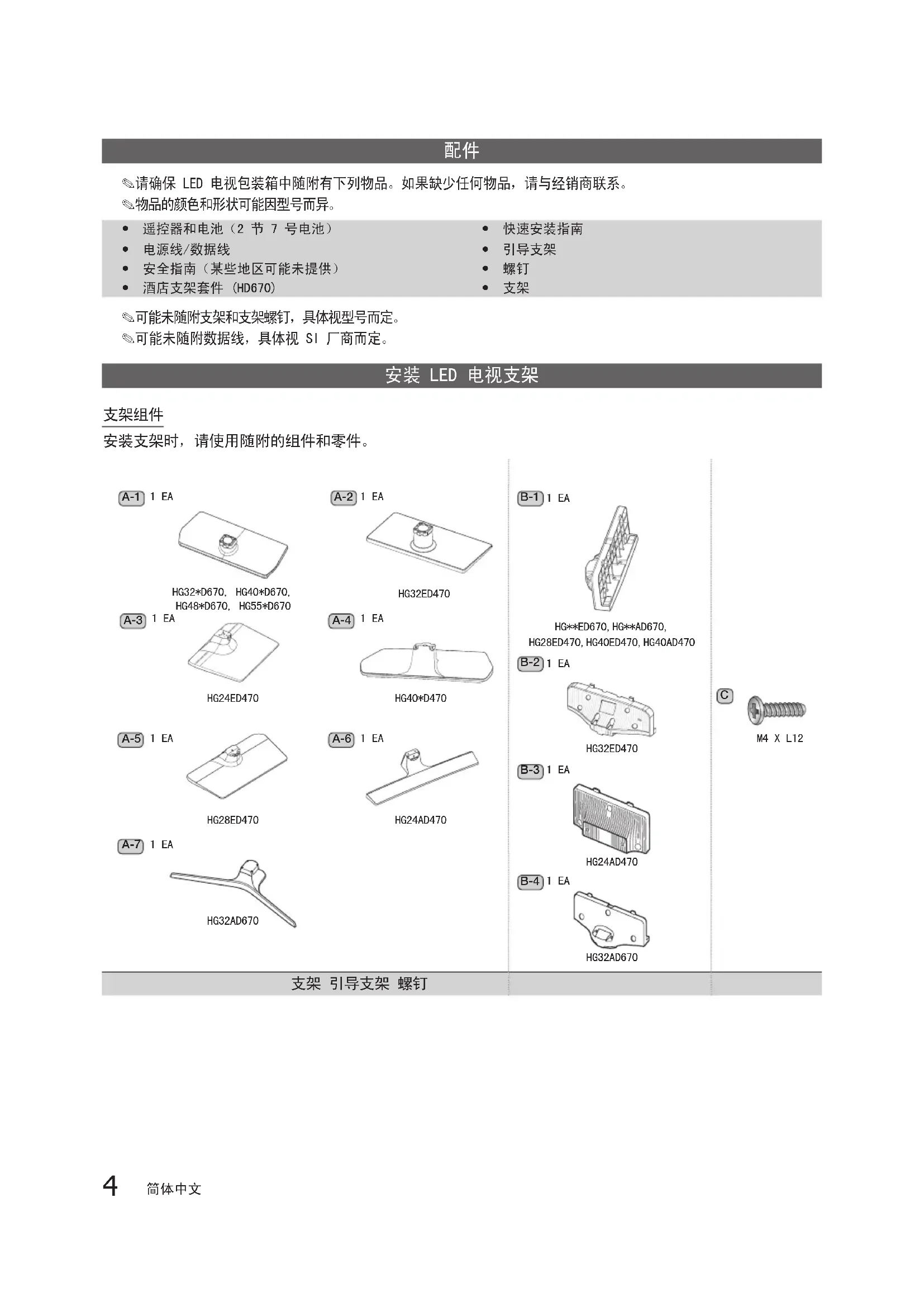 ✎ 请确保 LED 电视包装箱中随附有下列物品。如果缺少任何物品,请与经销商联系。 ✎ 物品的颜色和形状可能因型号而异。 y 遥控器和电池(2 节 7 号电池) y 电源线/数据线 y 安全指南(某些地区可能未提供) y 酒店支架套件 (HD670) y 快速安装指南 y 引导支架 y 螺钉 y 支架 ✎ 可能未随附支架和支架螺钉,具体视型号而定。 ✎ 可能未随附数据线,具体视 SI 厂商而定。 安装 LED 电视支架