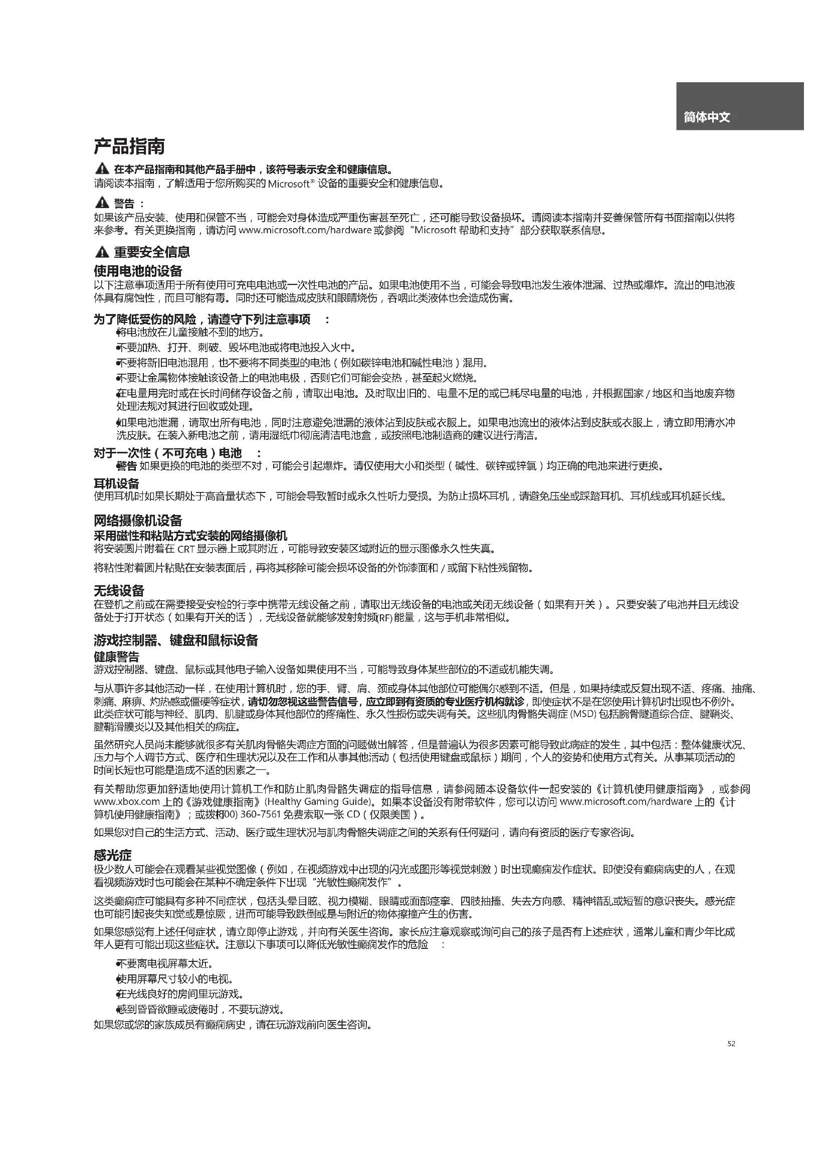 如果该产品安装、使用和保管不当,可能会对身体造成严重伤害甚至死亡,还可能导致设备损坏。请阅读本指南并妥善保管所有书面指南以供将 来参考。有关更换指南,请访问 www.microsoft.com/hardware