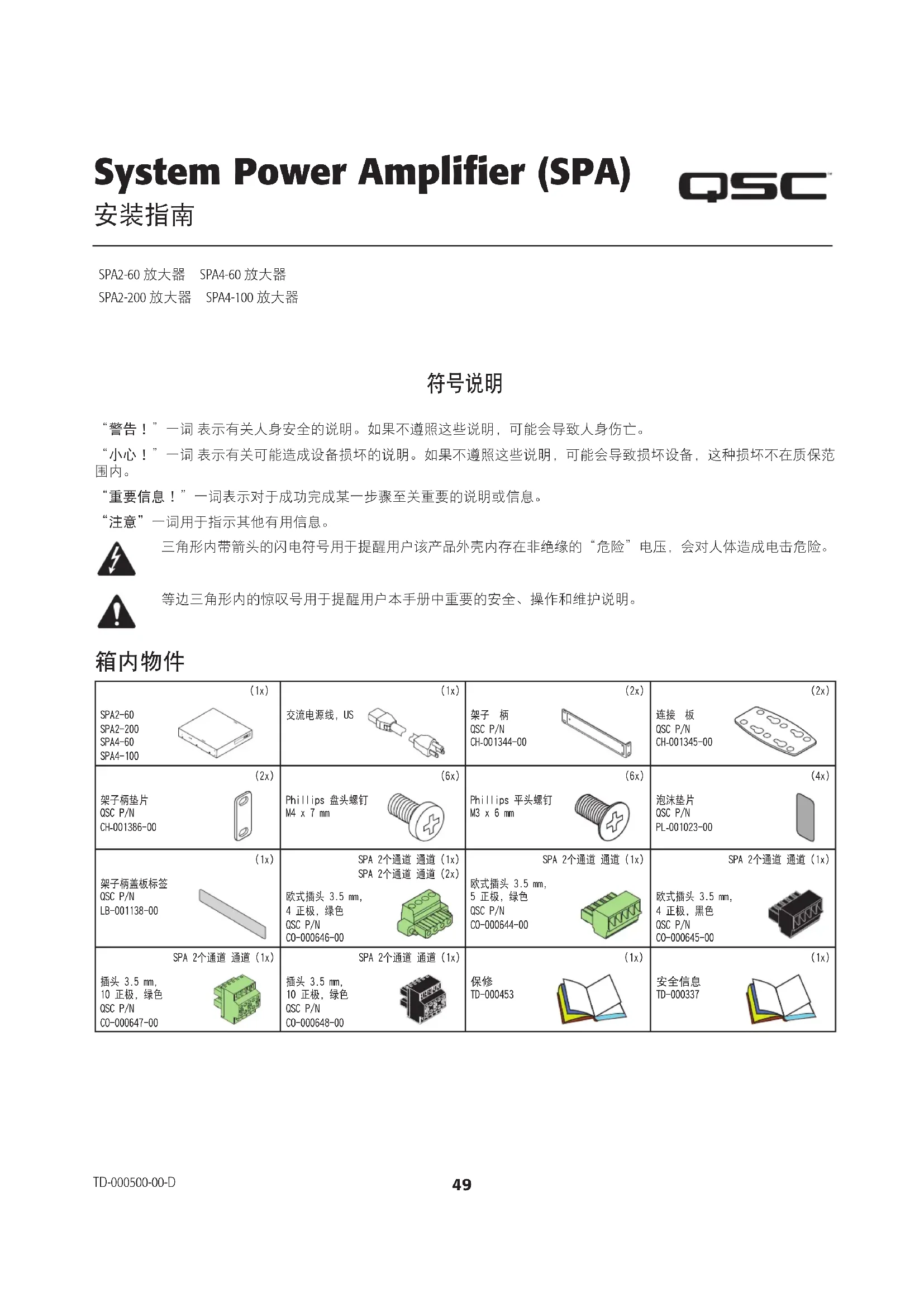 (1x) 架子柄盖板标签 QSC P/N LB-001138-00SPA 2个通道 通道 (1x) SPA 2个通道 通道 (2x)欧式插头 3.5 mm, 4 正极,绿色 QSC P/N CO-000646-00 SPA 2个通道 通道 (1x)欧式插头 3.5 mm, 5 正极, 绿色 QSC P/N CO-000644-00 SPA 2个通道 通道 (1x) 欧式插头 3.5 mm, 4 正极,黑色 QSC P/N CO-000645-00 SPA 2个通道 通道 (1x)插头 3.5 mm, 10 正极,绿色 QSC P/N CO-000647-00 SPA 2个通道 通道 (1x)插头 3.5 mm, 10 正极,绿色 QSC P/N CO-000648-00 (1x)保修 TD-000453 (1x) 安全信息 TD-000337 TD-000500-00-D50 TD-000500-00-D
