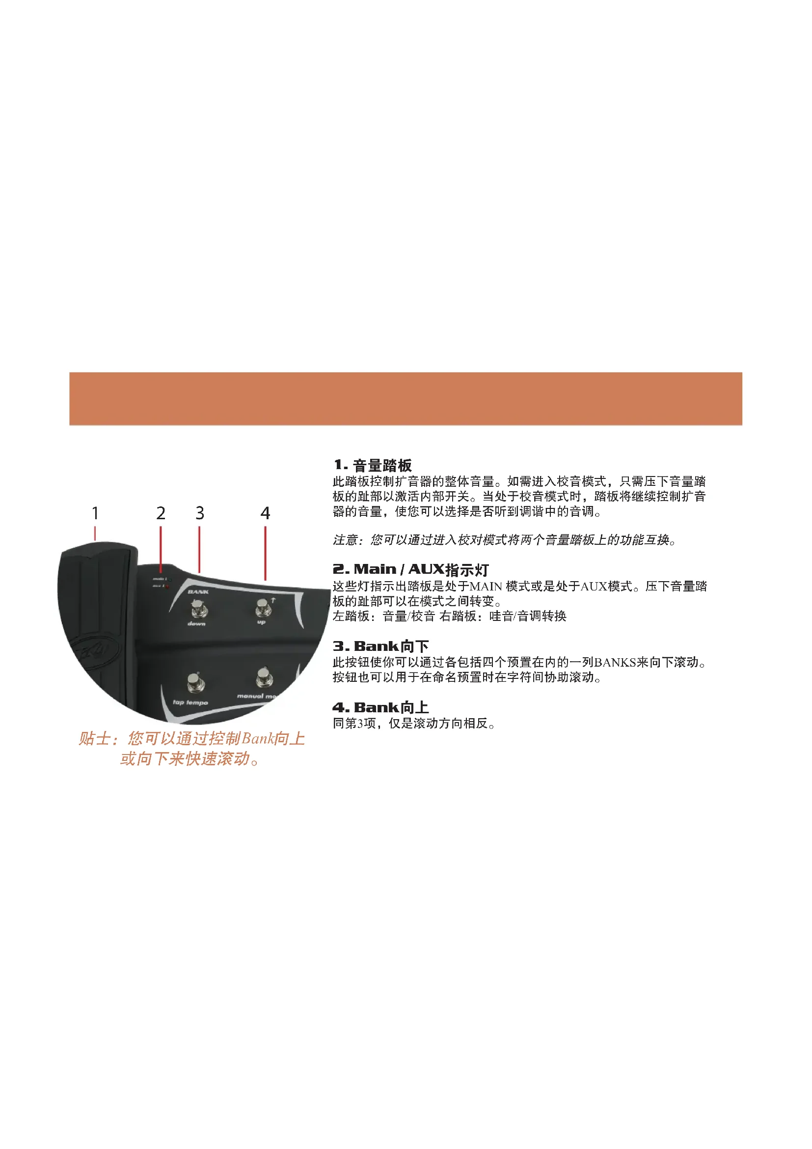 这些灯指示出踏板是处于MAIN 模式或是处于 AUX 模式。压下音量踏板的趾部可以在模式之间转变。左踏板:音量