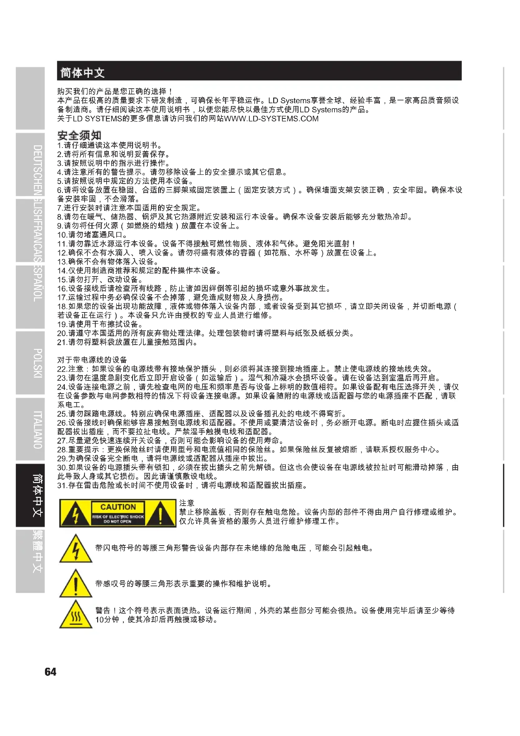 禁止移除盖板,否则存在触电危险。设备内部的部件不得由用户自行修理或维护。 仅允许具备资格的服务人员进行维护修理工作。 带闪电符号的等腰三角形警告设备内部存在未绝缘的危险电压,可能会引起触电。 带感叹号的等腰三角形表示重要的操作和维护说明。 警告!这个符号表示表面烫热。设备运行期间,外壳的某些部分可能会很热。设备使用完毕后请至少等待 10分钟,使其冷却后再触摸或移动。DEUTSCH ENGLISH FRANCAISESPAÑOL POLSKI ITALIANO