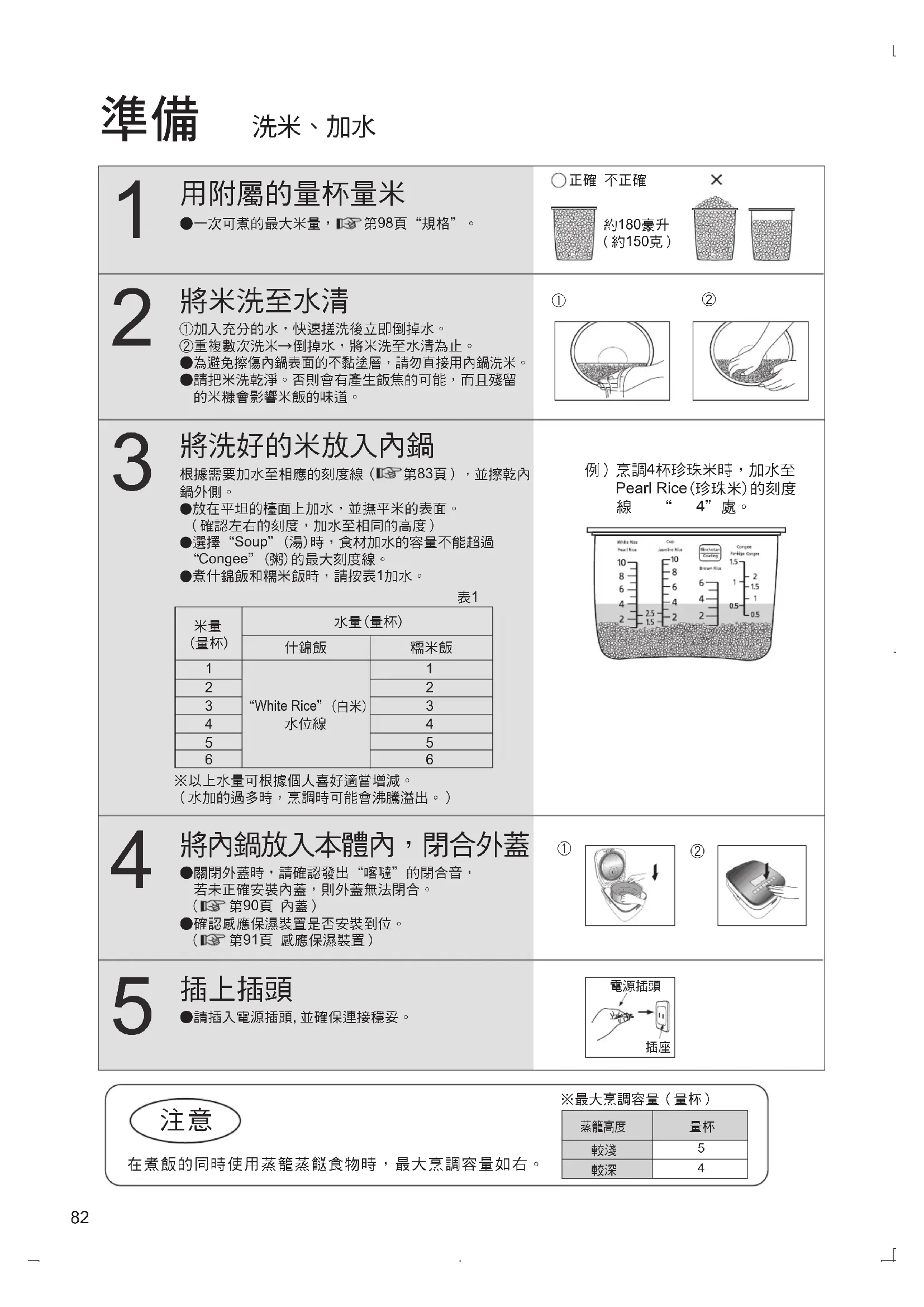 例)烹調4杯珍珠米時,加水至 Pearl Rice(珍珠米)的刻度 線“4"處。●一次可煮的最大米量, 第98頁“規格"。根據需要加水至相應的刻度線( 第83頁),並擦乾內 ●放在平坦的檯面上加水,並撫平米的表面。 (確認左右的刻度,加水至相同的高度)●選擇“Soup"(湯)時,食材加水的容量不能超過 “Congee"(粥)的最大刻度線。●煮什錦飯和糯米飯時,請按表1加水。●請插入電源插頭,並確保連接穩妥。 將內鍋放入本體內,閉合外蓋 ●關閉外蓋時,請確認發出“喀噠"的閉合音, 若未正確安裝內蓋,則外蓋無法閉合。 ( 第90頁 內蓋)●確認感應保濕裝置是否安裝到位。 ( 第91頁 感應保濕裝置)※最大烹調容量(量杯) 在煮飯的同時使用蒸籠蒸餸食物時,最大烹調容量如右。
