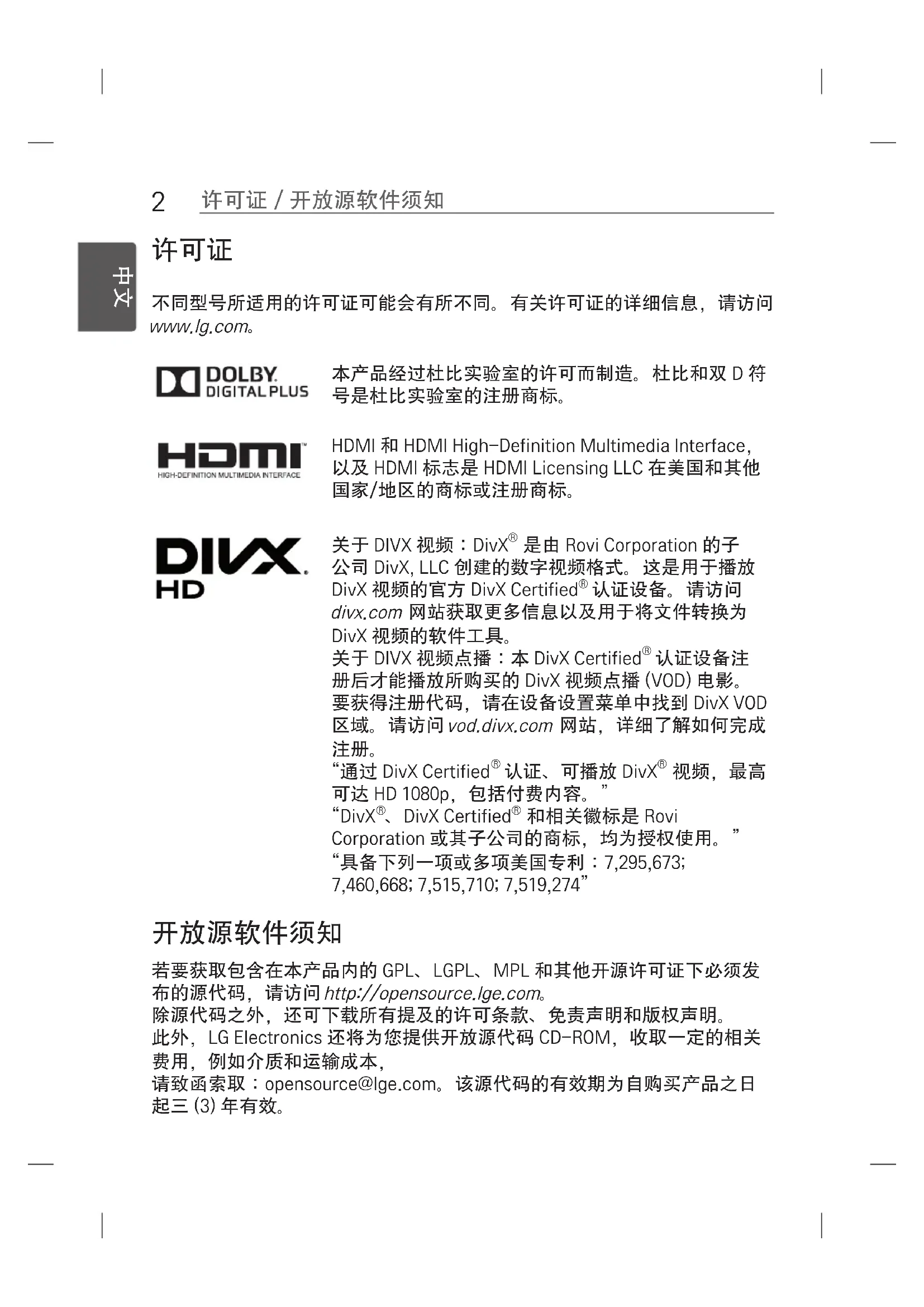 除源代码之外,还可下载所有提及的许可条款、免责声明和版权声明。 此外,LG Electronics 还将为您提供开放源代码 CD-ROM,收取一定的相关 费用,例如介质和运输成本, 请致函索取:opensource@lge.com。该源代码的有效期为自购买产品之日 起三 (3) 年有效。3 ENG中文