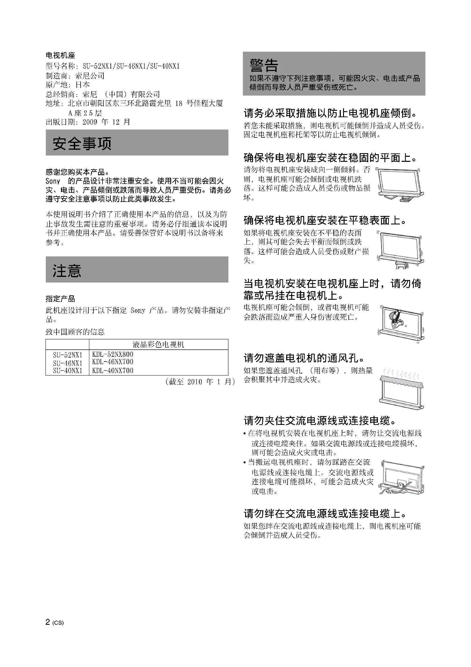 如果不遵守下列注意事项,可能因火灾、电击或产品 倾倒而导致人员严重受伤或死亡。3 (CS) 请勿安装指定产品之外的其他设备。 本电视机座专门设计用于指定产品。如果您安装非指定 设备,则可能跌落或破裂,并造成人员受伤。除非另有说 明,本手册中使用的插图为 KDL-40NX80s
