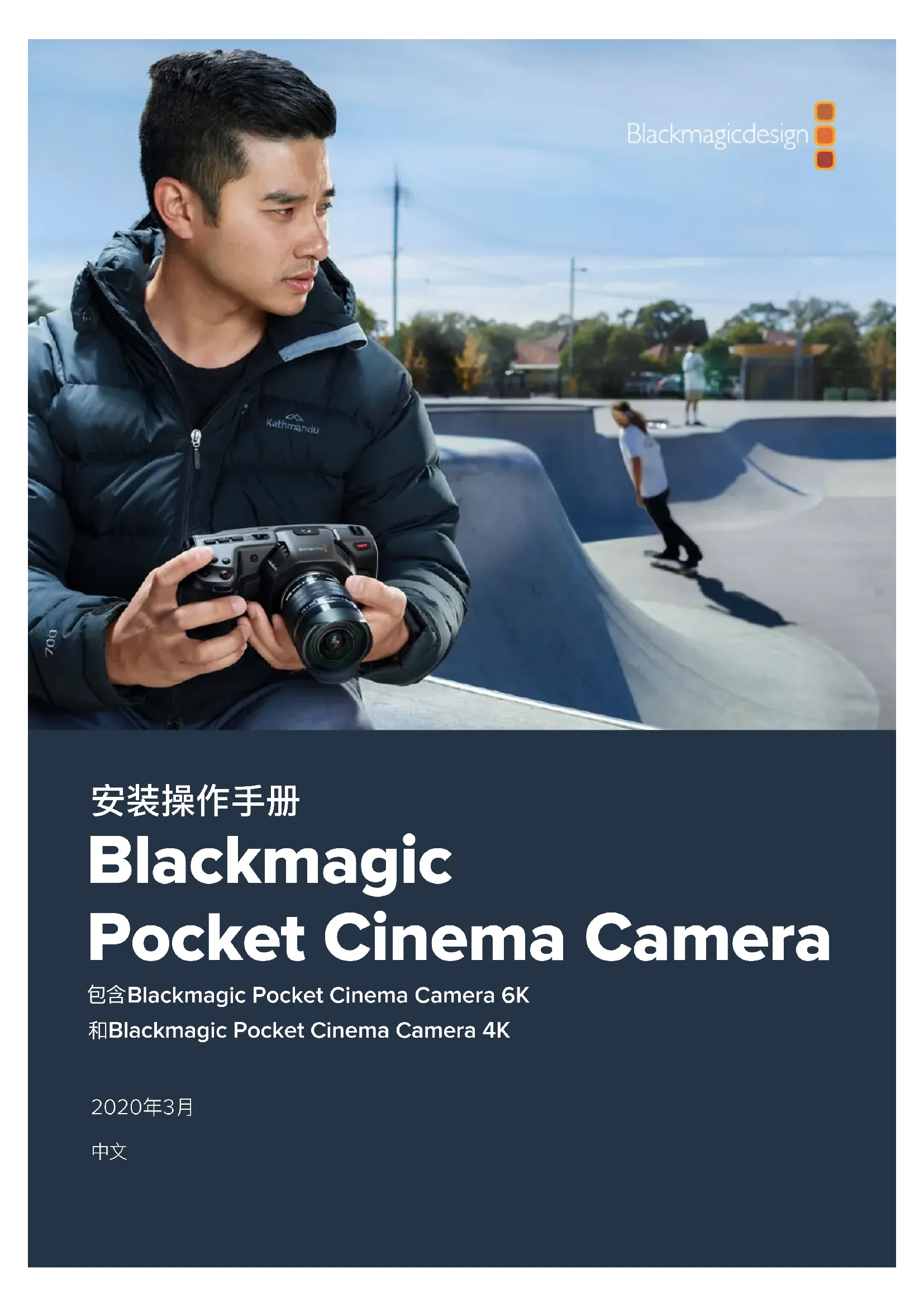 LCD 触摸屏,可快速查看对焦和画面细节,明亮日光下也可清楚查看各项信息。同时, 它的四个内置麦克风还能直接在摄影机内部记录高品质音频! 将Blackmagic Pocket Cinema Camera连接到ATEM Mini切 换 台 后 ,还 能 获 得 强 大 的 CCU功能, 在ATEM Software Control的摄影机页面更加直观地设置摄影机的对焦、快门、光圈、色彩等参数! Blackmagic Pocket Cinema Camera机身坚固耐久并兼顾轻质便携的优点,可随身携带。同时, 摄影机还支持我们的Blackmagic RAW编解码格式,让您在一个文件里就能获得灵活的RAW处理 功能,降低文件大小的同时大幅提升表现。 期待能一睹您使用新款Pocket Cinema Camera摄影机完成的创意佳作。同时,也欢迎您就摄影机 有待添加的各项新功能向我们提出宝贵意见! Grant Petty Blackmagic Design首席执行官您使用的是哪款摄影机? 800 入门 801 安装镜头 801 启动摄影机 802 使用BlackmagicPocketCamera BatteryGrip802 使用内附的电源线为摄影机供电 804 存储介质 805 CFast 卡 805