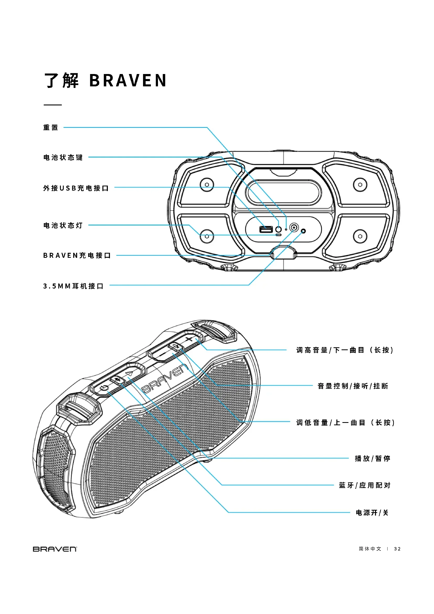 为减少火灾或电击的危险,请勿将 BRAVEN暴露在雨中或潮湿的环境充 电。 BRAVEN不应暴露在液体滴漏或飞 溅 的 环 境 ,B R A V E N 在 充 电 时 或 为 其 他 设 备 充 电 时 ,不 应 放 在 诸 如 花 瓶 等 装 有 液 体 的 物 件 上 及 其 附 近 。像 其 他 任 何 电 子 产 品一样,本产品在使用时要慎防将液体 泼洒到任何部件里。液体可以导致产品出 现故障和/或有发生火灾的危险。电源仅 限在室内使用。请勿改装产品或配件。未 经授权而自行改动可能会影响安全性、 合规性和系统性能,会使保修无效。请勿 将点燃的蜡烛等任何火源放在BRAVEN 上及其附近。BRAVEN含有小部件,可能 会导致窒息风险,不适合3岁以下儿童。 如果电池在规定的充电时间内未达到完 全充电状态,请勿继续充电。过度充电会 导致电池发烫、破裂或燃烧。如果您看到 任何热变形或泄漏,请妥善处置电池。请 勿在32°F ~104 ° F(0°C~40°C)的温 度范围以外给电池充电。如果电池开始 漏液,请勿让液体接触皮肤或眼睛。如果 接触到电池液,请用大量清水冲洗干净 并立即就医。请勿将本产品或电池暴露 在包括阳光直射、明火等的过热环境中, 或在炎热的天气里汽车内存放或使用, 车内的温度可以超过115°F(60°C)。否 则可能会导致电池和电源产生热量、破 裂 或 燃 烧 。以 这 种( 不 当 )方 式 使 用 本 产 品也可能会导致产品性能损失及寿命缩 短。长时间暴露在阳光直射的地方可能 会损害产品外观和材料的品质。请勿践 踏、投掷电池,或让电池、电源或设备掉 落,或将其处于强烈的冲击危险中。请勿 以 任 何 方 式 致 使 电 池 或 电 源 刺 破 、挤 压 、 凹陷或变形。如果两者中有任何一个变 形 ,请 妥 善 处 置 好 。请 勿 让 电 池 短 路 。请 勿尝试自行维修BRAVEN。打开或拆卸 护 盖 可 能 会 导 致 电 击 或 其 他 危 险 ,并 且 会导致制造商的保修无效。为防止火灾 或 电 击 的 危 险 ,应 避 免 墙 上 插 座 、延 长 电 线或整体方便插座过载。您的蓝牙设备 (手机、音乐播放器、平板电脑、笔记本 电脑等)必须支持A2DP蓝牙配置文件, 这样您的新款BRAVEN扬声器能够以无 线方式工作。A2DP配置文件受大多数最 新移动产品支持,具有内置蓝牙功能。请 参阅您的设备用户手册以了解更多有关 该设备支持的蓝牙配置文件之详细信息 和说明。本设备符合美国联邦通讯法规 第15节的规定。设备工作应符合以下两 个条件:(1)该设备不可能引起有害干 扰,且(2)该设备必须接受所收到的任 何干扰,其中包括可能导致非正常工作 的干扰。 备注: 按照美国联邦通讯委 员会规则的第15节规定,本设备已经过 测试并证实符合B类数字设备的限制规 定。这些限制规定旨在提供合理的保护 以防止设备在住宅区安装时产生有害干 扰。本设备的生成和使用可以辐射射频 能量,如果不按照说明进行安装和使用, 可能会对无线电通讯造成有害干扰。然 而,本设备不能保证在特定的安装中不 会产生干扰。如果本设备确实对无线电 或 电 视 接 收 造 成 有 害 干 扰( 可 通 过 关 闭 、 打开设备来确定),推荐用户尝试用以下 一种或多种方式加以纠正: 措施:-调整 接收天线的方向或位置,-增加设备和接 收器之间的距离,-将设备连接到不同于 接收器连接电路的电源插座上,-咨询经 销商或有经验的无线电/电视技术人员以 获得帮助。 注意事项:任何未经有关方 面明确批准的改动或改装可能导致用户 操作设备的权限失效。 美国联邦通讯委 员会辐射暴露声明:本设备符合美国联 邦通讯委员会关于在不受控制的环境中 辐射限制的规定。本设备已进行评估,满 足普通无线电设备辐射要求。本设备可 用于便携式的辐射条件而不受限制。 本 设备符合加拿大工业部免许可证的RSS 标 准 。 设 备 工 作 应 符 合 以 下 两 个 条 件 :( 1 )该 设 备 不 可 能 引 起 有 害 干 扰 ,且( 2 )该 设备必须接受所收到的任何干扰,其中 包 括 可 能 导 致 非 正 常 工 作 的 干 扰 。根 据 加 拿 大 工 业 部 条 例 的 规 定 ,该 无 线 电 发 射器可能只在使用某种类型的天线下工 作 ,其 最 大( 或 稍 少 )增 益 获 得 加 拿 大 工 业部有关发射机方面的批准。为减少对其 他 用 户 造 成 潜 在 的 无 线 电 干 扰 ,选 择 天 线类型及增益应根据等效全向辐射功率 (equivalent isotropically radiated power,e.i.r.p.)不大于成功通信所需的 量。本设备已进行评估,满足普通无线电 设备辐射要求。本设备可用于便携式的 辐射条件而不受限制。此B类数字设备符 合加拿大ICES-003标准。 所装锂电池 没有预定用户更换。 注意事项:电池安 装 不 正 确 会 导 致 爆 炸 危 险 。只 能 更 换 相 同或等效类型的电池。 将电源插头用作 断开设备时,该断开设备应可以随时工 作。 本设备符合RSS102标准第2.25段 规定的例行评估限制的豁免条件,并符 合RSS-102射频暴露标准,用户可以获得 有关加拿大射频暴露和合规性的信息。 正确处理本产品。此标志表示在欧盟 区内该产品不应和其他家庭废弃物一 同处置。 为防止无管制的废物处置对环 境或人类健康造成损害的可能,请以负 责 任 的 态 度 回 收 再 利 用 ,以 促 进 物 质 资 源的可持续再利用。要返回二手设备,请 使用回收系统,或联系您购买该产品时