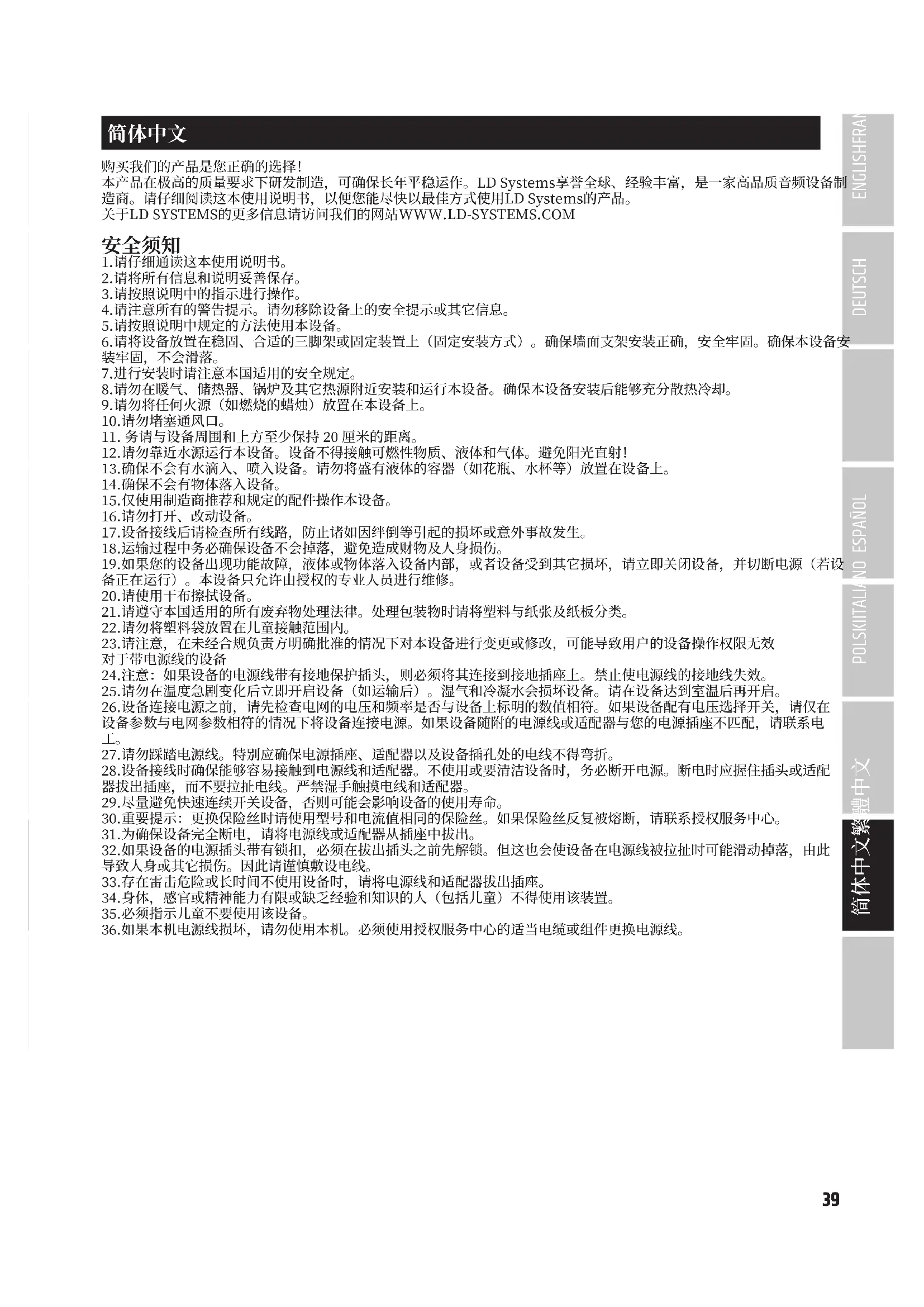 26.在設備連接到電源插座之前,請先檢查電源的電壓和頻率是否與設備上顯示的數值相符。若設備上具有電壓選擇器開 關,僅當設備上的數值與電源值相符合之後,方可將設備連接到插座。若提供的電源線或附帶的電源變壓器不適合您的插 座,請與電子專業人員聯絡。 27.請勿踩踏電源纜線。確保帶電電纜不要扭結,特別是在電源插座和電源變壓器和設備插座之處。 28.設備接線時,應確保總是可以自由接入電源線或電源變壓器。不使用設備時,或者希望清潔設備時,應切斷設備電源。 應從插頭或電源變壓器上拔掉電源線和變壓器,不要從插座上拔下纜線。切勿用濕手觸碰電源線和電源變壓器。 29.如果可能的話,請盡量不要快速接通或切斷設備電源,否則會影響設備壽命。 30.重要提示:僅使用相同類型和額定值的保險絲來更換。若保險絲反覆燒斷,請聯絡授權服務中心。 31.若需將設備完全切斷電源,請將電源線或電源變壓器從牆壁插座上拔下。 32.若設備上配有可鎖定的電源連接器,僅當相應的設備插頭解鎖後,方可將其拔下。但是,在拉動電源線時會導致設備滑 落或傾倒,造成人員傷害或其他損壞之危險。請小心佈放纜線。 33.若存在閃電危險時,或者長時間不使用設備時,應從牆壁上插座斷開電源線和電源變壓器。 34.身體,感官或精神能力有限或缺乏經驗和知識的人(包括兒童)不得使用該裝置。 35.必須指示兒童不要使用該設備。 36.如果本機電源線損壞,請勿使用本機。必須使用授權服務中心的適當電纜或組件更換電源線。46 DEUTSCHENGLISH FRANCAIS ESPAÑOL POLSKI ITALIANO