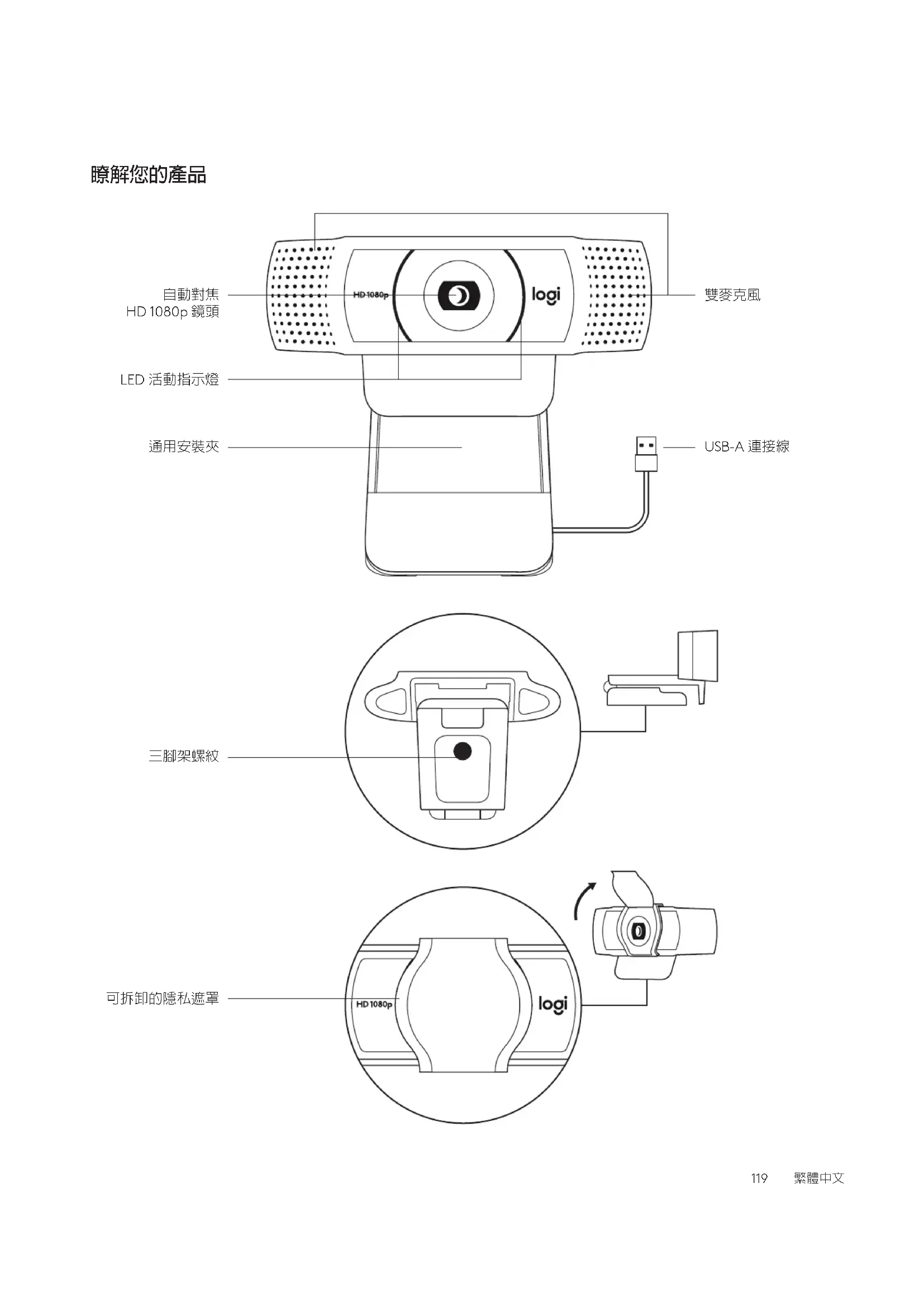1 含 1.5 公尺 (5 英呎) USB-A 連接線的網路攝影機 2 隱私遮罩 3 使用者文件 USB-A 2 將其裝在網路攝影機前方正中間上方的位置。 3 在需要時手動調整隱私遮罩開啟或關閉。 120 繁體中文設定網路攝影機