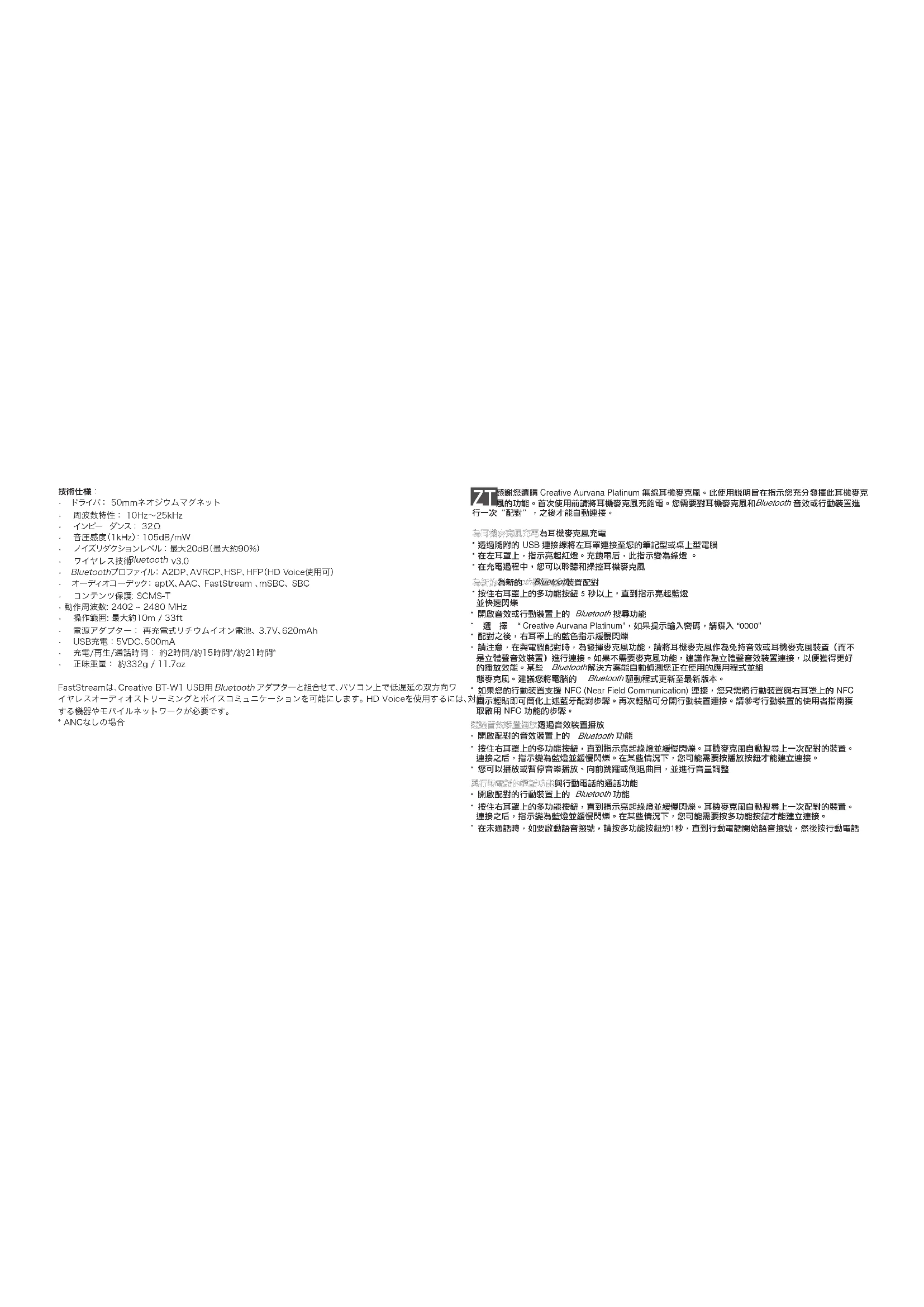 - 净重:332 克 / 11.7 盎司 FastStream 技术可搭配 Creative BT-W1 Bluetooth USB 收发器,实现低延迟、双向无线音频传输和语音 通讯 。 HD Voice 仅适用于支持的智能手机和移动网络。