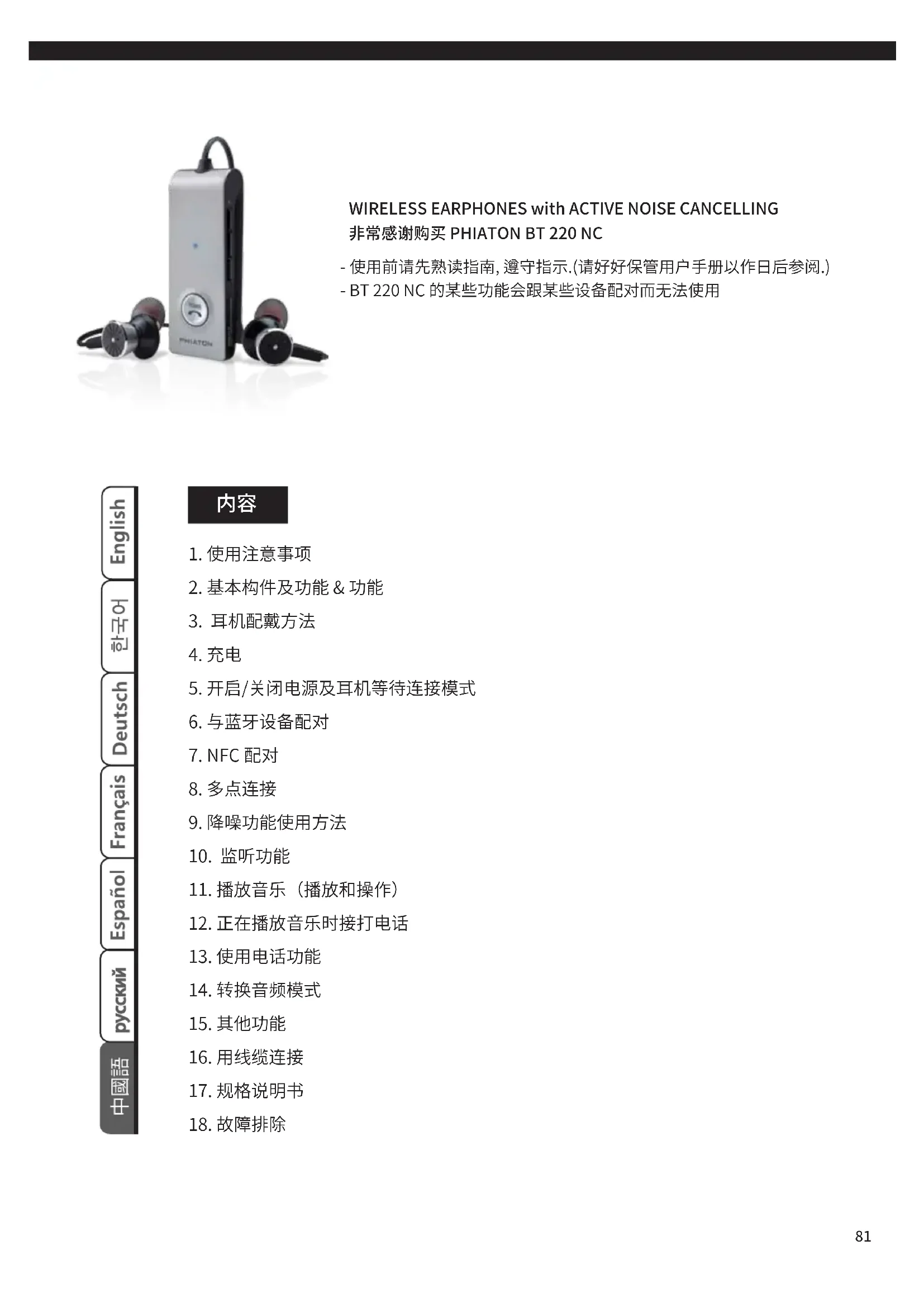 使用前请先熟读指南, 遵守指示.(请好好保管用户手册以作日后参阅.) - BT 220 NC 的某些功能会跟某些设备配对而无法使用