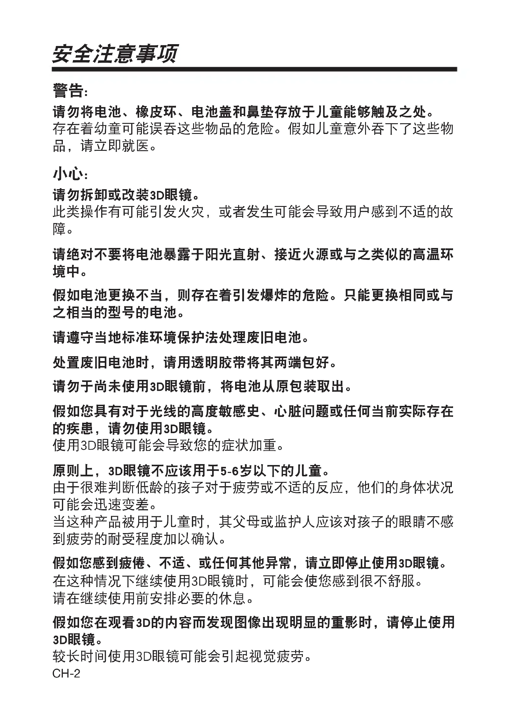 当这种产品被用于儿童时,其父母或监护人应该对孩子的眼睛不感 到疲劳的耐受程度加以确认。 假如您感到疲倦、不适、或任何其他异常,请立即停止使用3D眼镜。 在这种情况下继续使用3D眼镜时,可能会使您感到很不舒服。 请在继续使用前安排必要的休息。 假如您在观看3D的内容而发现图像出现明显的重影时,请停止使用 3D眼镜。 较长时间使用3D眼镜可能会引起视觉疲劳。CH-3