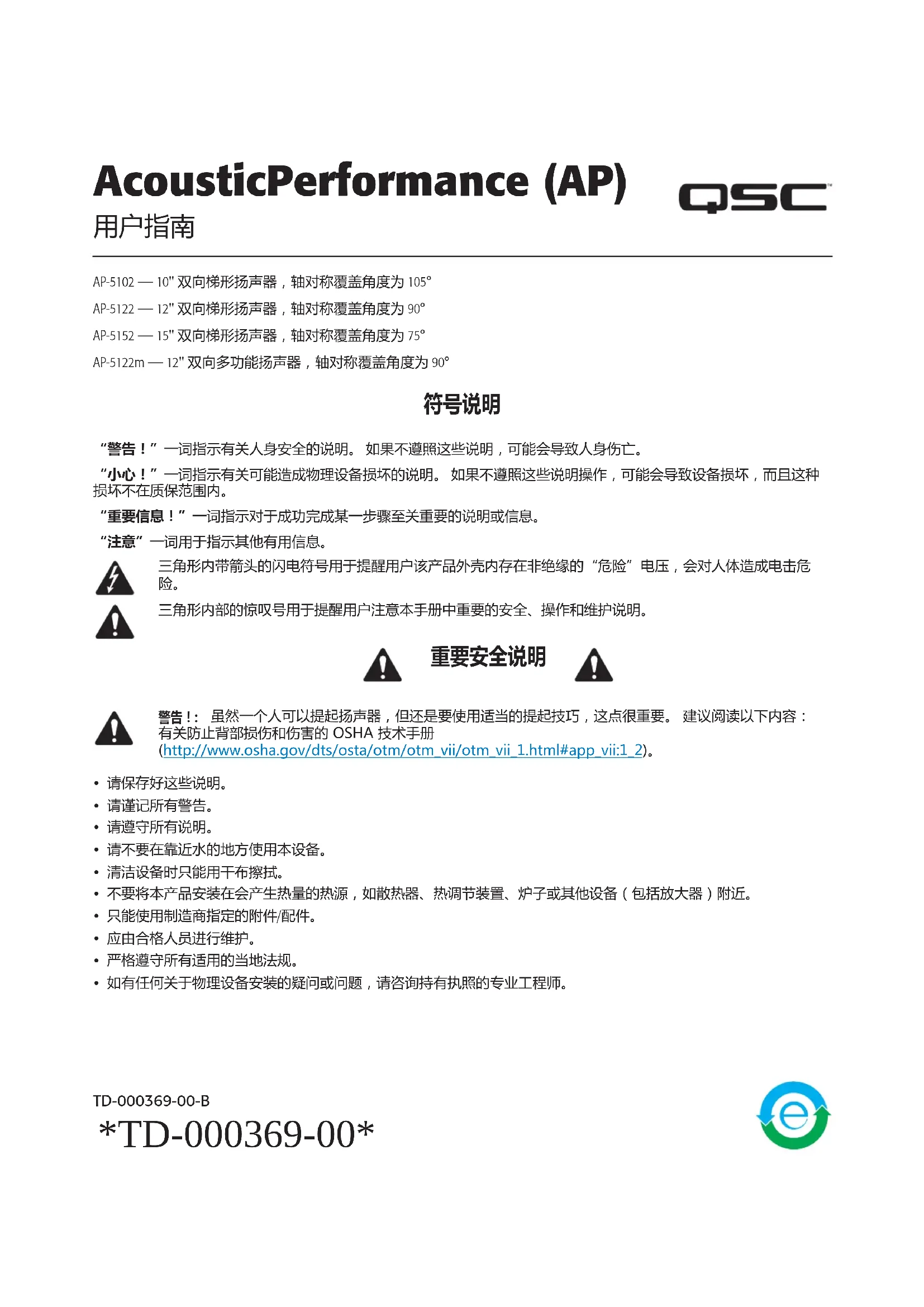 “警告!”一词指示有关人身安全的说明。 如果不遵照这些说明,可能会导致人身伤亡。“小心!”一词指示有关可能造成物理设备损坏的说明。 如果不遵照这些说明操作,可能会导致设备损坏,而且这种损坏不在质保范围内。“重要信息!”一词指示对于成功完成某一步骤至关重要的说明或信息。“注意”一词用于指示其他有用信息。三角形内带箭头的闪电符号用于提醒用户该产品外壳内存在非绝缘的“危险”电压,会对人体造成电击危险。 三角形内部的惊叹号用于提醒用户注意本手册中重要的安全、操作和维护说明。 警告!: 虽然一个人可以提起扬声器,但还是要使用适当的提起技巧,这点很重要。建议阅读以下内容:有关防止背部损伤和伤害的OSHA技术手册(http://www.osha.gov/dts/osta/otm/otm_vii/otm_vii_1.html#app_vii:1_2)。• 请保存好这些说明。• 请谨记所有警告。• 请遵守所有说明。• 请不要在靠近水的地方使用本设备。• 清洁设备时只能用干布擦拭。• 不要将本产品安装在会产生热量的热源,如散热器、热调节装置、炉子或其他设备(包括放大器)附近。• 只能使用制造商指定的附件/配件。• 应由合格人员进行维护。 • 严格遵守所有适用的当地法规。• 如有任何关于物理设备安装的疑问或问题,请咨询持有执照的专业工程师。 *TD-000369-00* TD-000369-00-B2