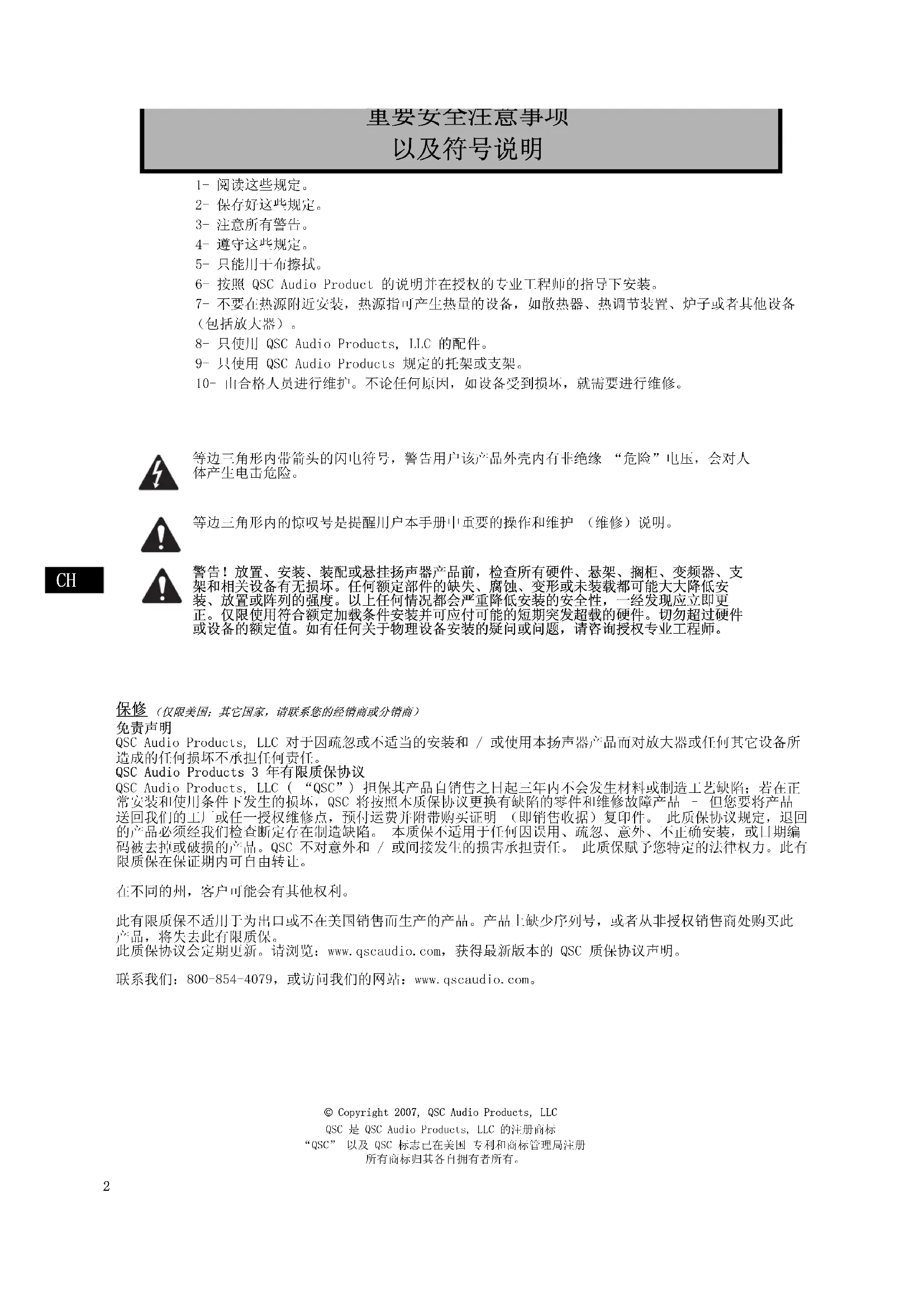 QSC Audio Products, LLC 对于因疏忽或不适当的安装和 / 或使用本扬声器产品而对放大器或任何其它设备所 造成的任何损坏不承担任何责任。 QSC Audio Products 3 年有限质保协议 QSC Audio Products, LLC ( “QSC”) 担保其产品自销售之日起三年内不会发生材料或制造工艺缺陷;若在正 常安装和使用条件下发生的损坏,QSC 将按照本质保协议更换有缺陷的零件和维修故障产品 – 但您要将产品 送回我们的工厂或任一授权维修点,预付运费并附带购买证明 (即销售收据)复印件。 此质保协议规定,退回 的产品必须经我们检查断定存在制造缺陷。 本质保不适用于任何因误用、疏忽、意外、不正确安装,或日期编 码被去掉或破损的产品。QSC 不对意外和 / 或间接发生的损害承担责任。 此质保赋予您特定的法律权力。此有 限质保在保证期内可自由转让。 在不同的州,客户可能会有其他权利。 此有限质保不适用于为出口或不在美国销售而生产的产品。产品上缺少序列号,或者从非授权销售商处购买此 产品,将失去此有限质保。 此质保协议会定期更新。请浏览:www.qscaudio.com,获得最新版本的 QSC 质保协议声明。 联系我们:800-854-4079,或访问我们的网站:www.qscaudio.com。CH