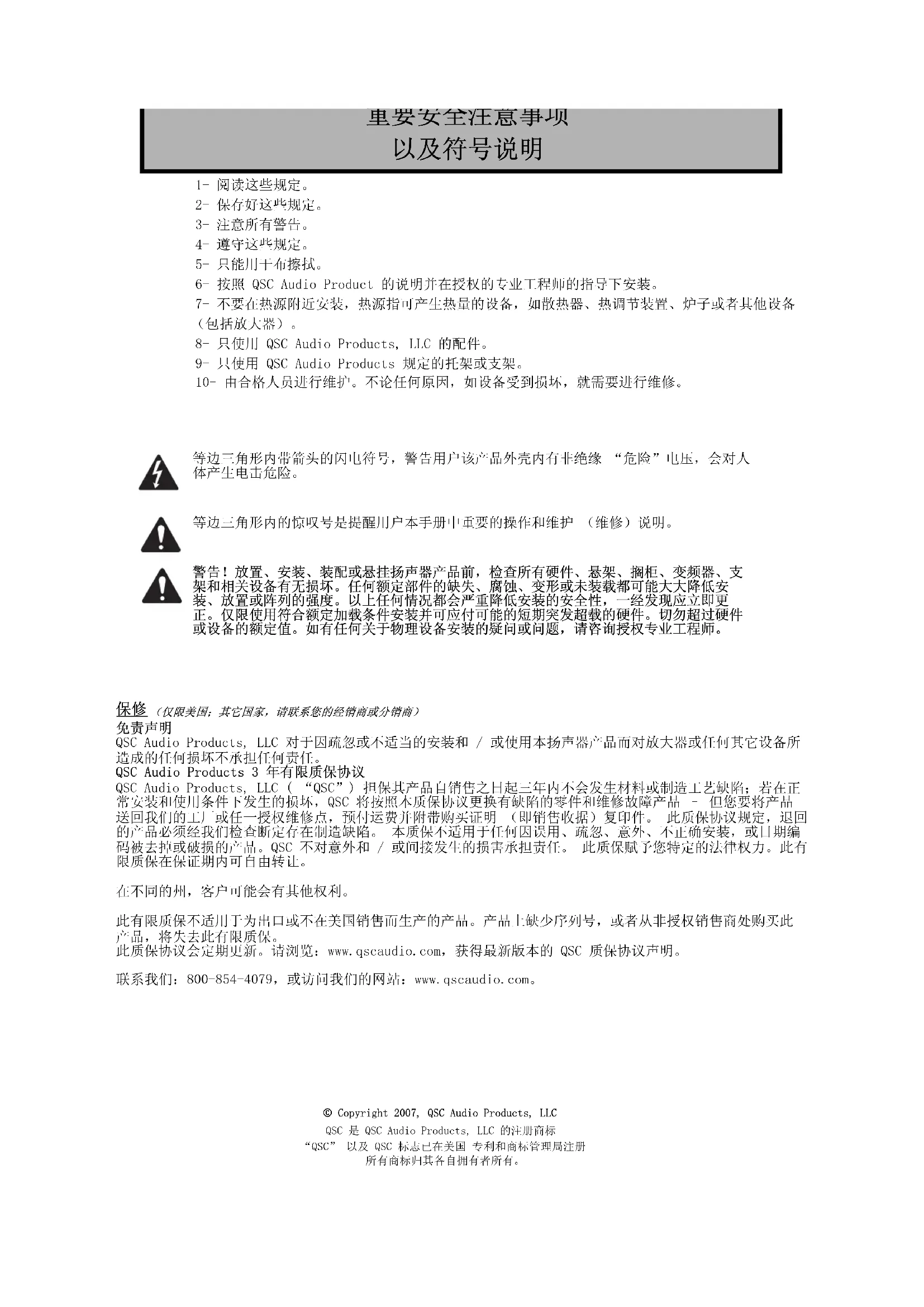 等边三角形内的惊叹号是提醒用户本手册中重要的操作和维护 (维修)说明。 警告!放置、安装、装配或悬挂扬声器产品前,检查所有硬件、悬架、搁柜、变频器、支 架和相关设备有无损坏。任何额定部件的缺失、腐蚀、变形或未装载都可能大大降低安 装、放置或阵列的强度。以上任何情况都会严重降低安装的安全性,一经发现应立即更 正。仅限使用符合额定加载条件安装并可应付可能的短期突发超载的硬件。切勿超过硬件 或设备的额定值。如有任何关于物理设备安装的疑问或问题,请咨询授权专业工程师。 © Copyright 2007, QSC Audio Products, LLC QSC 是 QSC Audio Products, LLC 的注册商标 “QSC” 以及 QSC 标志已在美国 专利和商标管理局注册 所有商标归其各自拥有者所有。