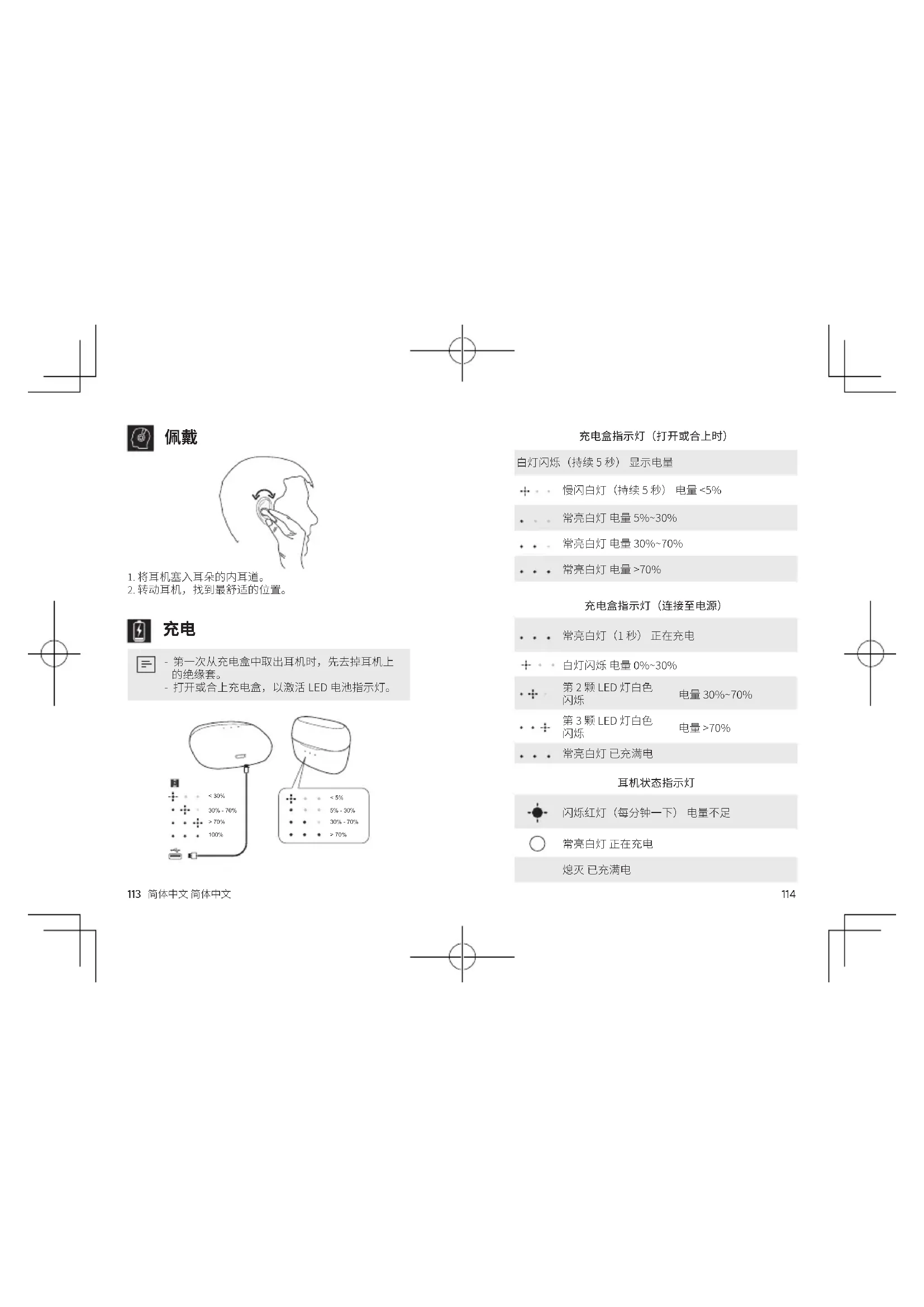 - 打开或合上充电盒,以激活 LED 电池指示灯。 < 30% 30% - 70% > 70% 100% 5% - 30% < 5% 30% - 70% > 70% 充电盒指示灯(打开或合上时) 白灯闪烁(持续 5 秒) 显示电量 慢闪白灯(持续 5 秒) 电量 <5% 常亮白灯 电量 5%~30% 常亮白灯 电量 30%~70% 常亮白灯 电量 >70% 充电盒指示灯(连接至电源) 常亮白灯(1 秒) 正在充电 白灯闪烁 电量 0%~30% 第 2 颗 LED 灯白色