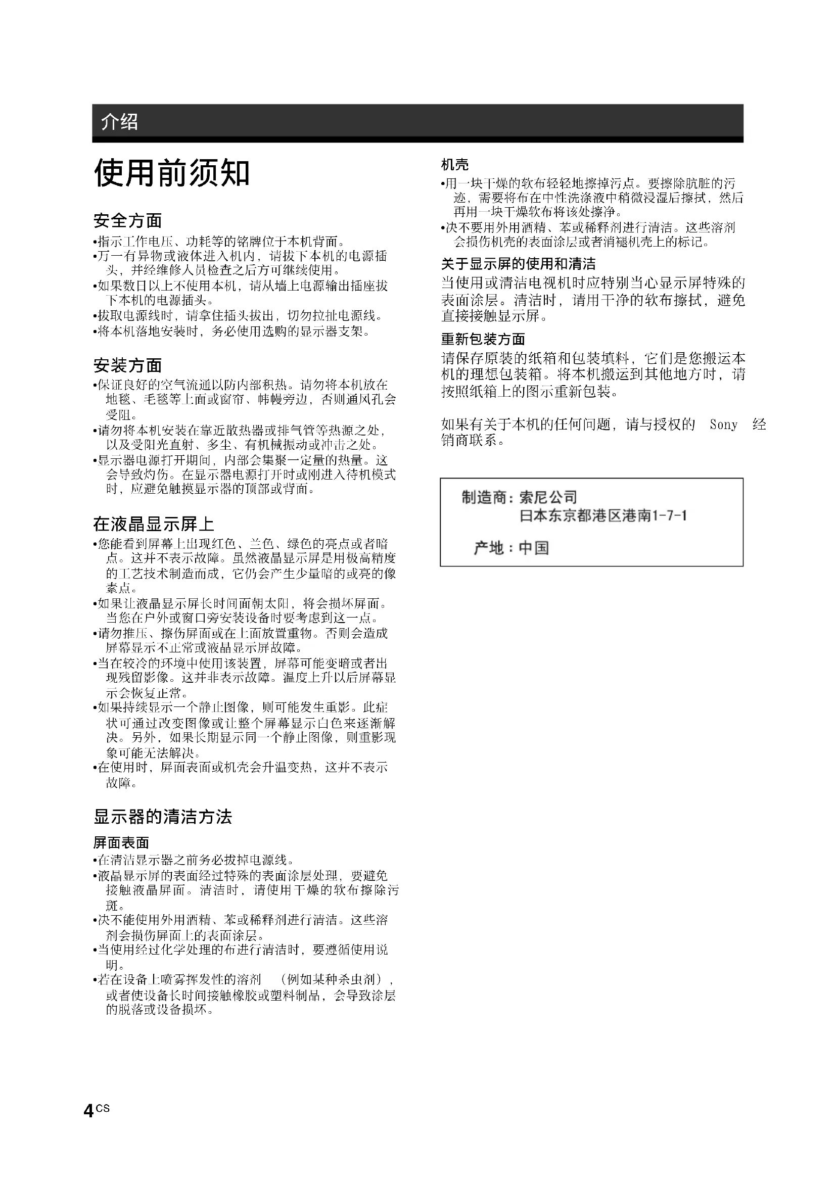 请保存原装的纸箱和包装填料,它们是您搬运本 机的理想包装箱。将本机搬运到其他地方时,请 按照纸箱上的图示重新包装。 如果有关于本机的任何问题,请与授权的 Sony 经