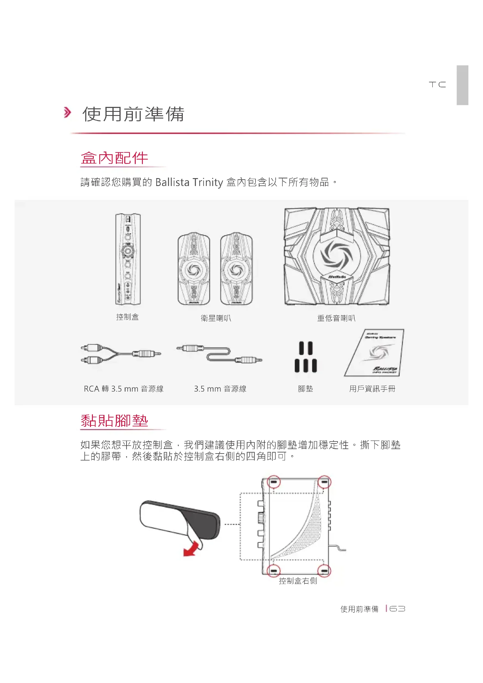 控制盒背面連接衛星喇叭、重低音喇叭、以及電腦音源到控制盒上。1. 將控制盒接上電源2. 按下電源鍵開啟您的 3. Ballista Trinity