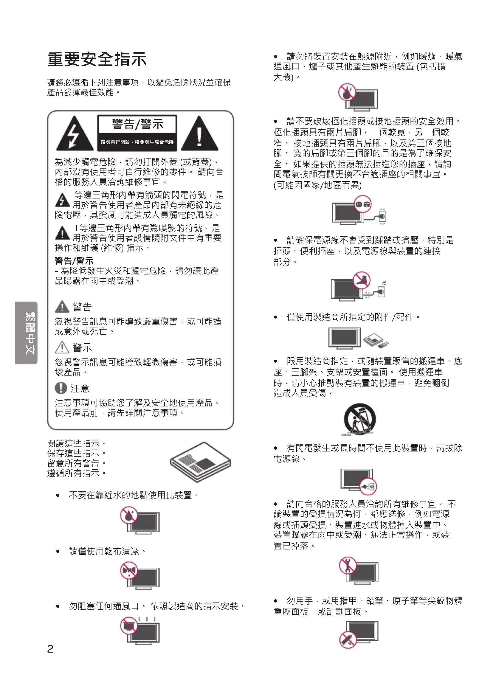 - 警告 - 為降低發生火災或觸電危險,請勿讓此 產品曝露在雨中、受潮或遭其他液體潑濕。 請 勿以濕手觸摸電視。 請勿將此產品安裝於可燃 物 (例如汽油或蠟燭) 附近,或將電視置於接近