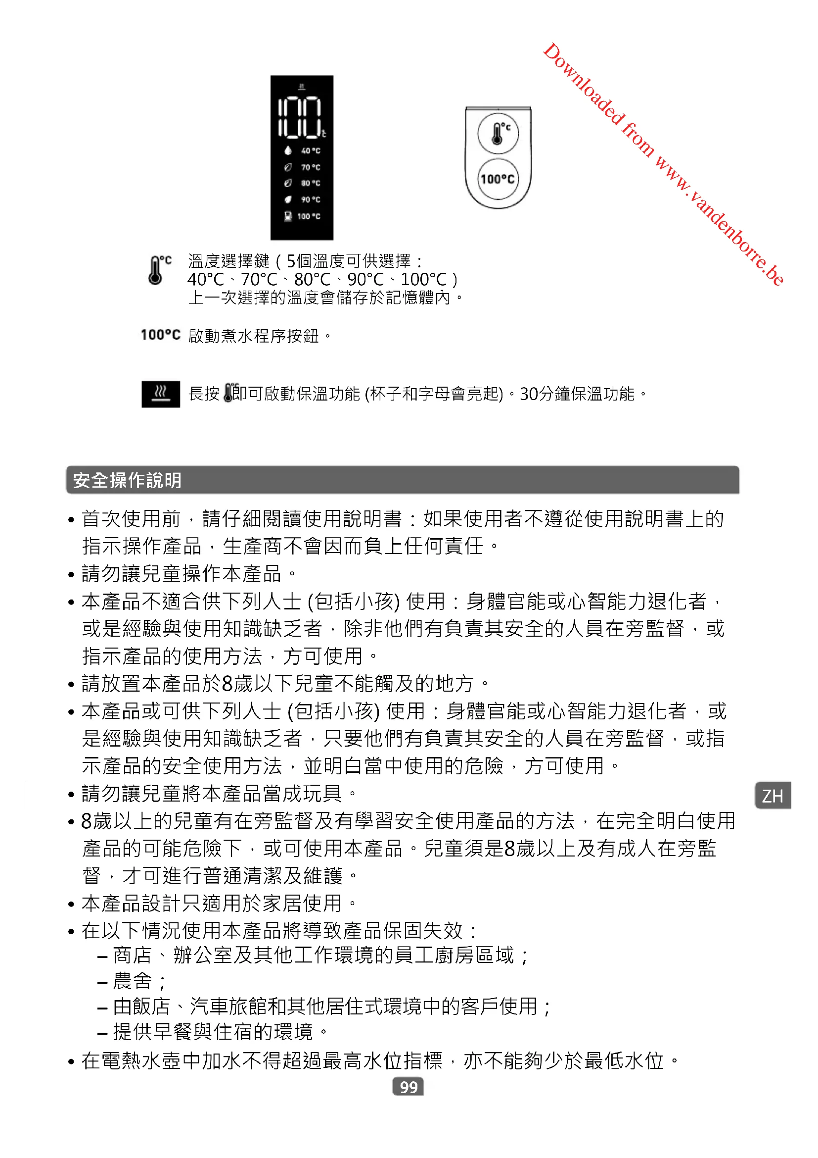 長按 即可啟動保溫功能 (杯子和字母會亮起)。30分鐘保溫功能。 Downloaded from www.vandenborre.be100