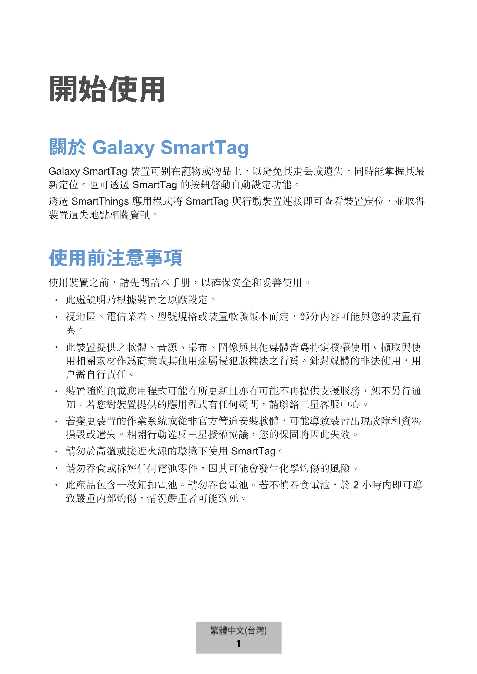 如為首次註冊 SmartTag,視周圍環境而定,註冊程序可能無法順利進行。可 能需嘗試 2–3 次始可成功完成註冊。