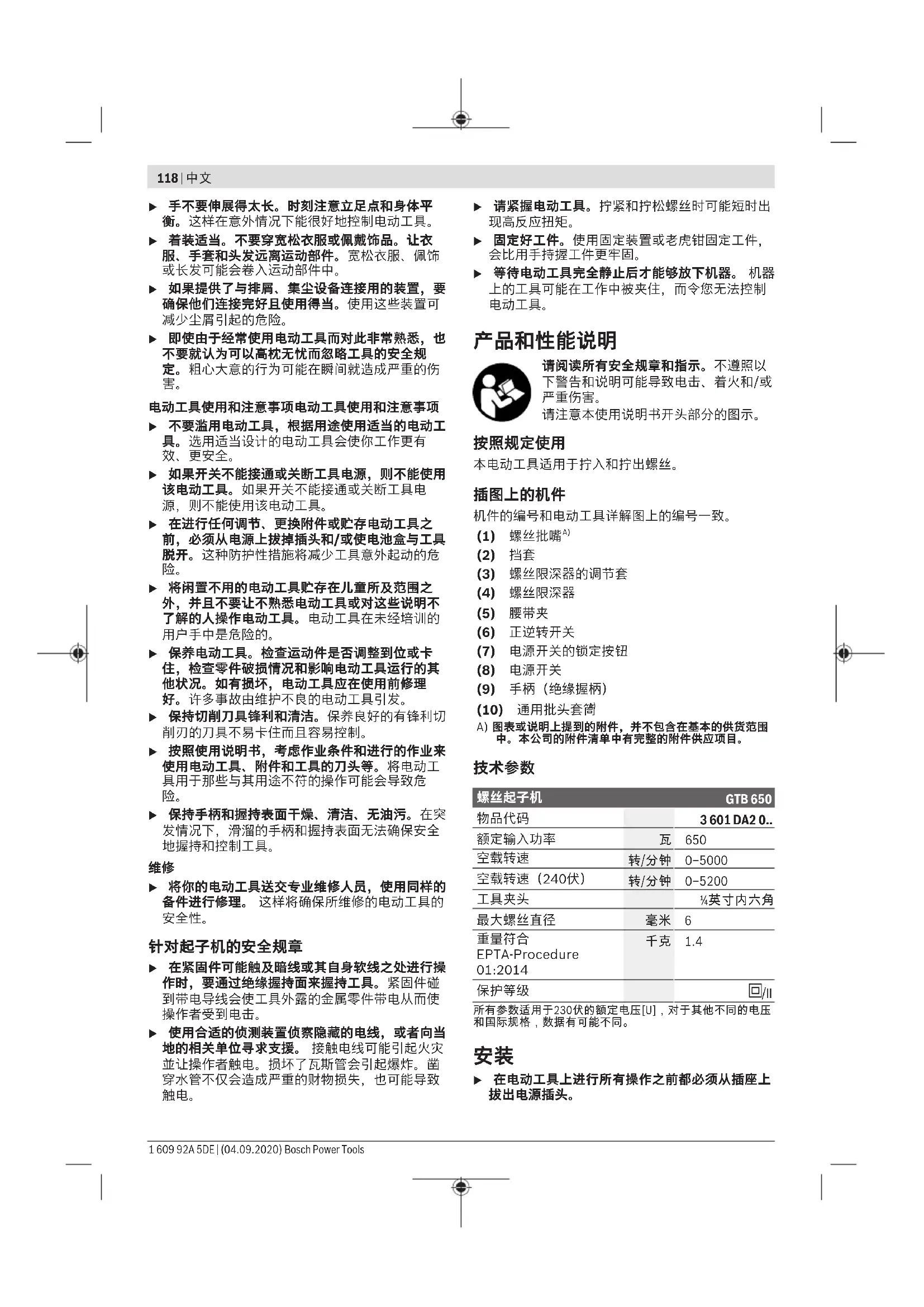 Bosch Power Tools 1 609 92A 5DE | (04.09.2020)118 | 中文 u 手不要伸展得太长。时刻注意立足点和身体平 衡。这样在意外情况下能很好地控制电动工具。 u 着装适当。不要穿宽松衣服或佩戴饰品。让衣 服、手套和头发远离运动部件。宽松衣服、佩饰 或长发可能会卷入运动部件中。 u 如果提供了与排屑、集尘设备连接用的装置,要 确保他们连接完好且使用得当。使用这些装置可