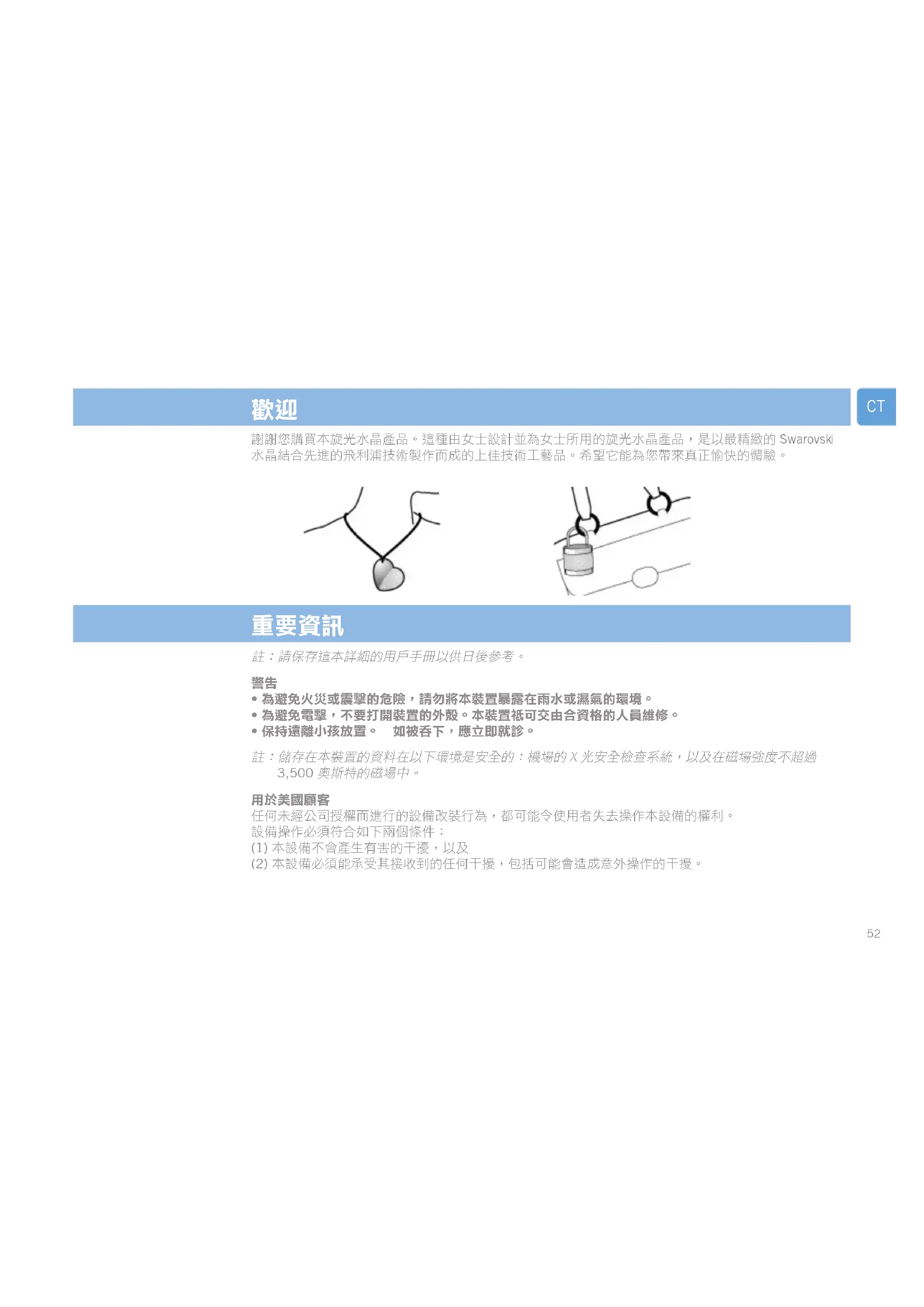 Технические спецификации Требуется помощь?謝謝您購買本旋光水晶產品。這種由女士設計並為女士所用的旋光水晶產品,是以最精緻的 Swarovski 水晶結合先進的飛利浦技術製作而成的上佳技術工藝品。希望它能為您帶來真正愉快的體驗。 註:請保存這本詳細的用戶手冊以供日後參考。
