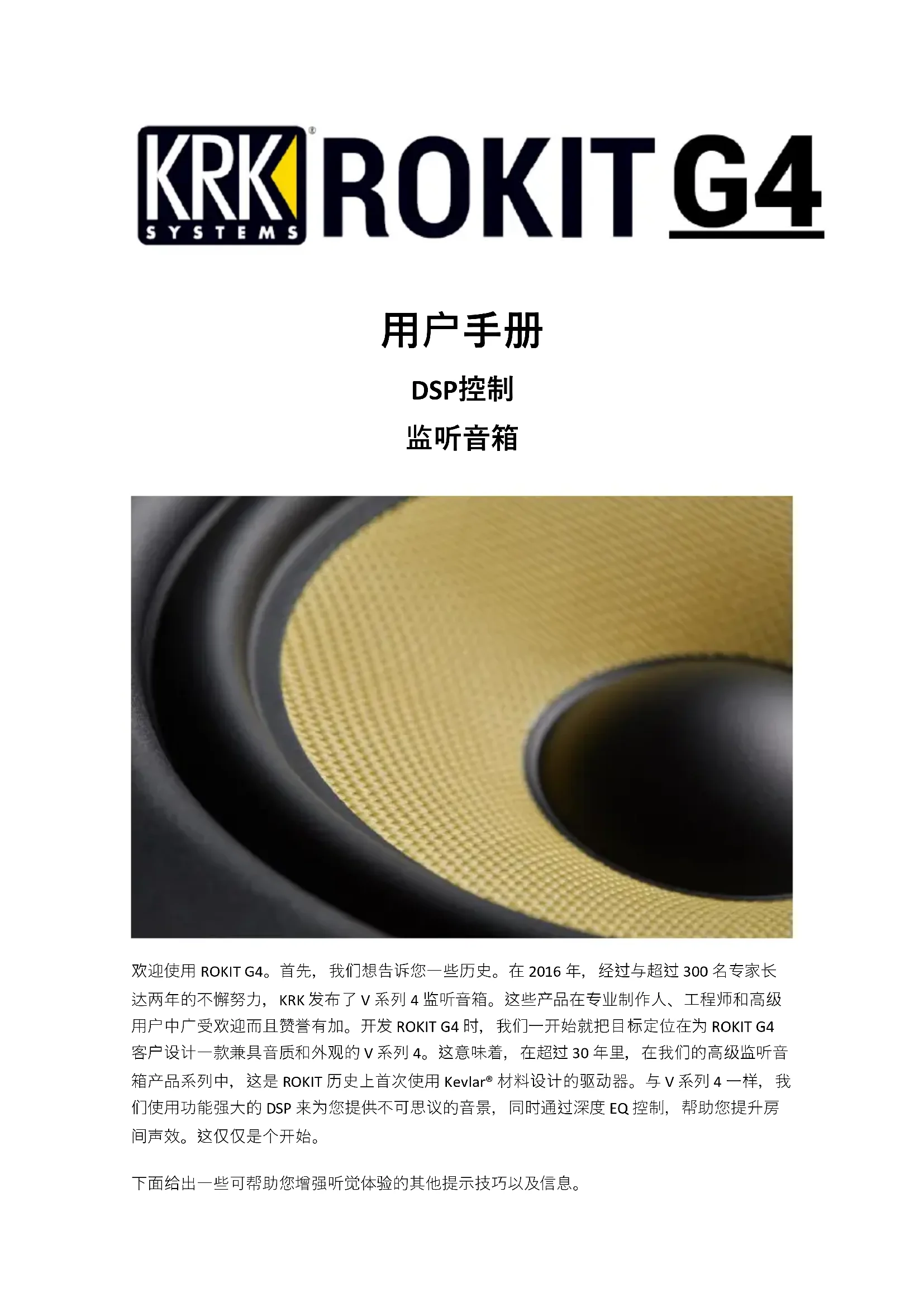欢迎使用 ROKIT G4。首先,我们想告诉您一些历史。在 2016 年,经过与超过 300 名专家长 达两年的不懈努力,KRK 发布了 V 系列 4 监听音箱。这些产品在专业制作人、工程师和高级