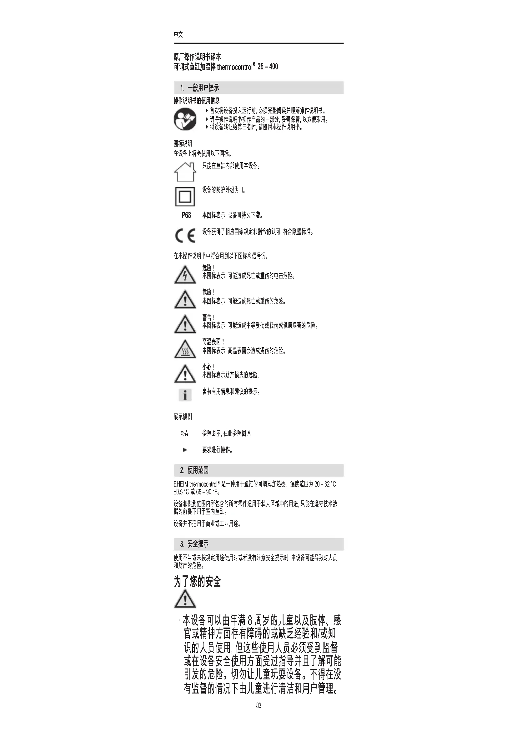 在设备上将会使用以下图标。 只能在鱼缸内部使用本设备。 设备的防护等级为 II。 本图标表示, 设备可持久下潜。 设备获得了相应国家规定和指令的认可, 符合欧盟标准。 在本操作说明书中将会用到以下图标和信号词。