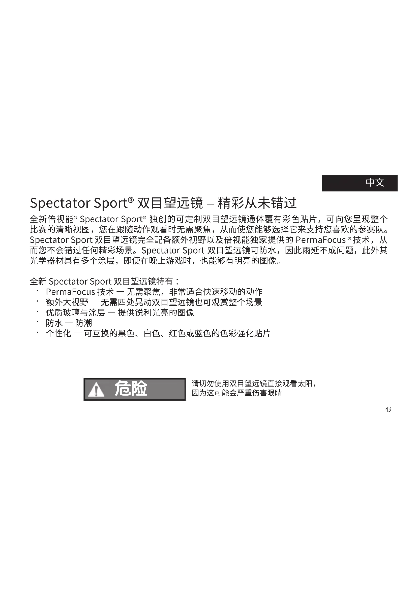 眼罩(下滚)45 感谢购买全新倍视能® Spectator Sport® 双目镜。 本手册将介绍双目望远镜的设置、使用以及护理方式,从而帮助您优化您的观看体验。请在使用双目望远镜
