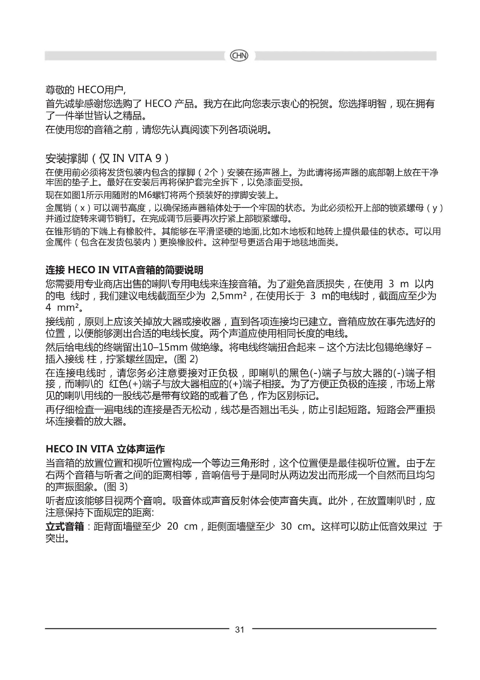 Оснастка: Эбонитовые шипы Эбонитовые шипы Металлические шипы Возможны технические изменения. 30尊敬的 HECO用户, 首先诚挚感谢您选购了 HECO 产品。我方在此向您表示衷心的祝贺。您选择明智,现在拥有 了一件举世皆认之精品。 在使用您的音箱之前,请您先认真阅读下列各项说明。 安装撑脚(仅 IN VITA 9) 在使用前必须将发货包装内包含的撑脚(2个)安装在扬声器上。为此请将扬声器的底部朝上放在干净 牢固的垫子上。最好在安装后再将保护套完全拆下,以免漆面受损。 现在如图1所示用随附的M6螺钉将两个预装好的撑脚安装上。 金属销(x)可以调节高度,以确保扬声器箱体处于一个牢固的状态。为此必须松开上部的锁紧螺母(y) 并通过旋转来调节销钉。在完成调节后要再次拧紧上部锁紧螺母。 在锥形销的下端上有橡胶件。其能够在平滑坚硬的地面,比如木地板和地砖上提供最佳的状态。可以用 金属件(包含在发货包装内)更换橡胶件。这种型号更适合用于地毯地面类。