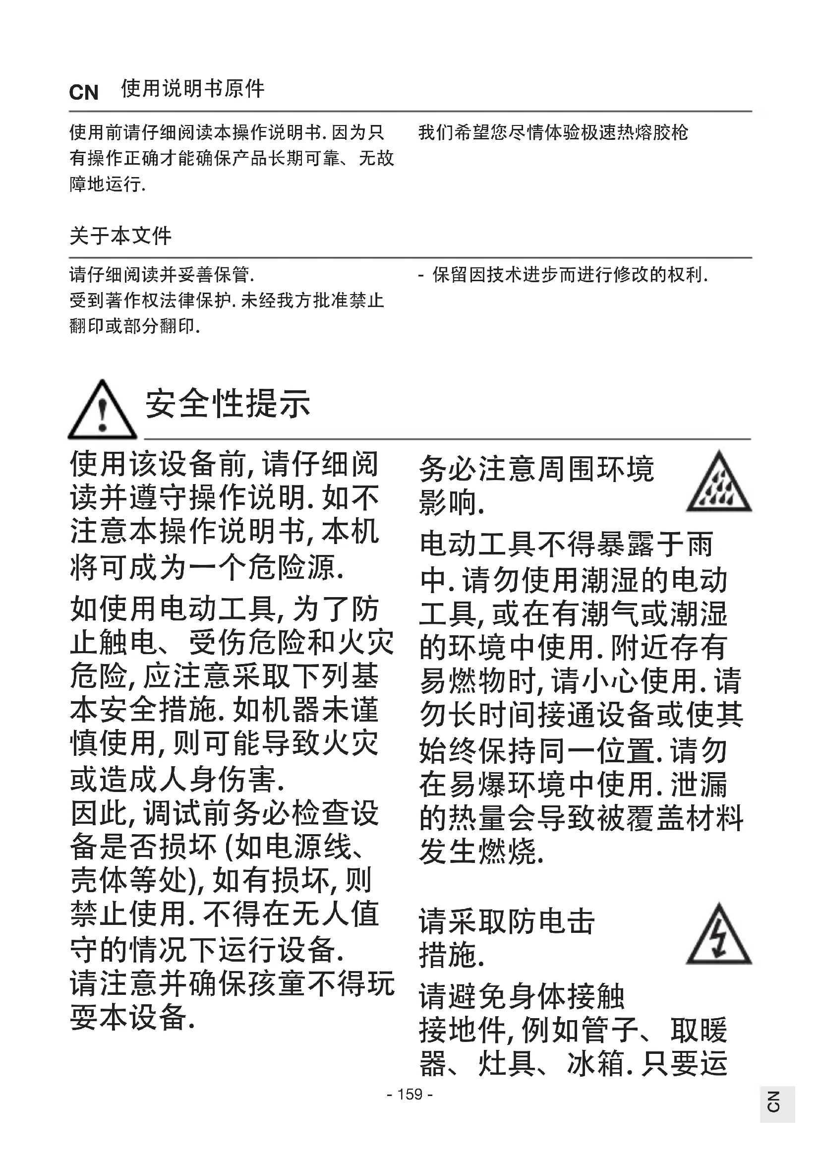 L 禁止使用液体或糊状粘合剂! L 胶浆温度最高达 200 摄氏度! 燃烧危险! L 燃烧危险! 皮肤接触高温粘合剂后: 立即 用冷水降温. 切勿尝试将熔化的胶浆从 皮肤上去除! 必要时立即就医. 眼睛接触 到高温粘合剂后: 立即使用自来水冷却 约 15 分钟, 然后及时就医. L 粘合位置必须干燥、洁净且无油脂. L 衣物上的粘合剂斑点无法清除. L 检查热敏材料的适用性. L 粘合剂滴最好在冷却后去除. L 不得将胶棒从设备中拉出. 进入设备内 的高温粘合剂可能造成损坏. L 不得结合易燃/可燃的材料使用. L 胶缝以及粘结位置可以重涂并可以通过