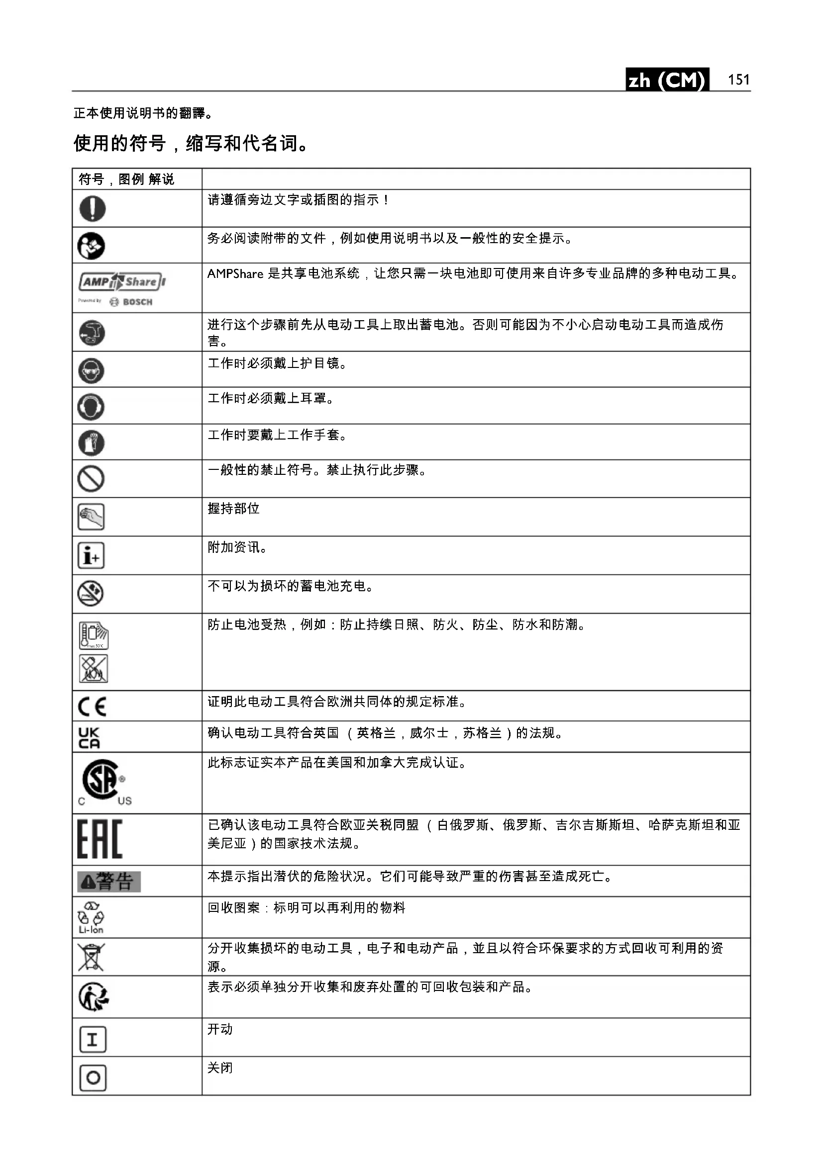 不可以为损坏的蓄电池充电。 防止电池受热,例如:防止持续日照、防火、防尘、防水和防潮。 证明此电动工具符合欧洲共同体的规定标准。 确认电动工具符合英国 (英格兰,威尔士,苏格兰)的法规。 此标志证实本产品在美国和加拿大完成认证。 已确认该电动工具符合欧亚关税同盟 (白俄罗斯、俄罗斯、吉尔吉斯斯坦、哈萨克斯坦和亚 美尼亚)的国家技术法规。 本提示指出潜伏的危险状况。它们可能导致严重的伤害甚至造成死亡。 回收图案:标明可以再利用的物料 分开收集损坏的电动工具,电子和电动产品,並且以符合环保要求的方式回收可利用的资