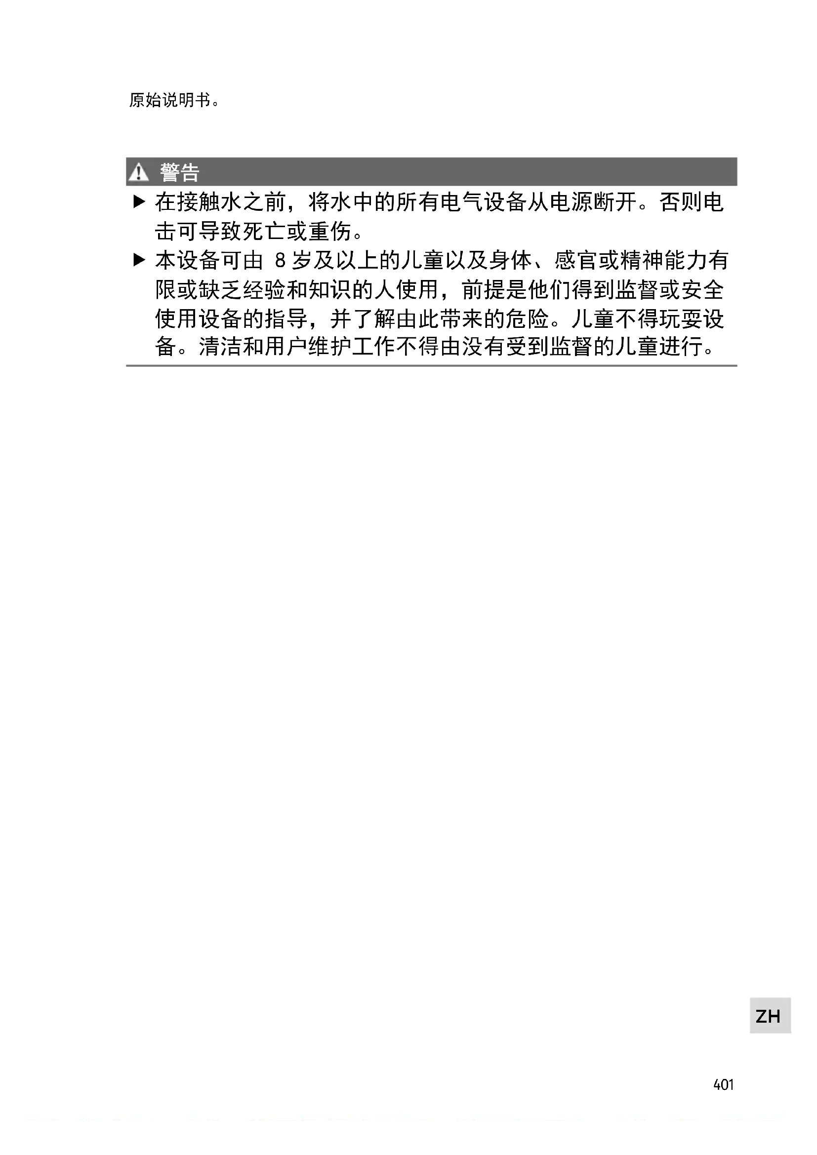 本设备可由 8 岁及以上的儿童以及身体、感官或精神能力有 限或缺乏经验和知识的人使用,前提是他们得到监督或安全 使用设备的指导,并了解由此带来的危险。儿童不得玩耍设 备。清洁和用户维护工作不得由没有受到监督的儿童进行。402