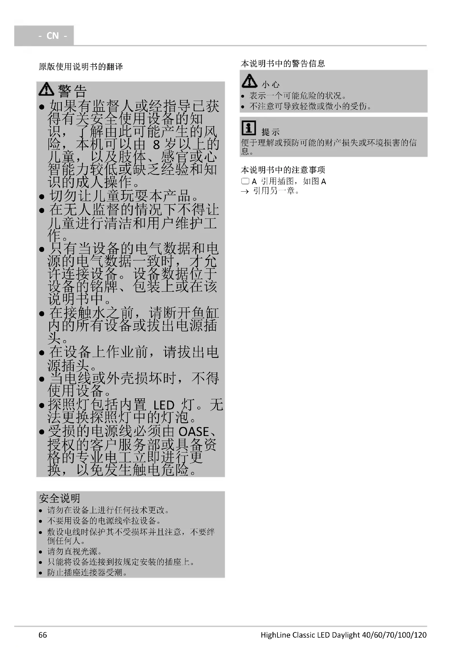 - 受损的电源线必须由 OASE、 授权的客户服务部或具备资 格的专业电工立即进行更 换,以免发生触电危险。