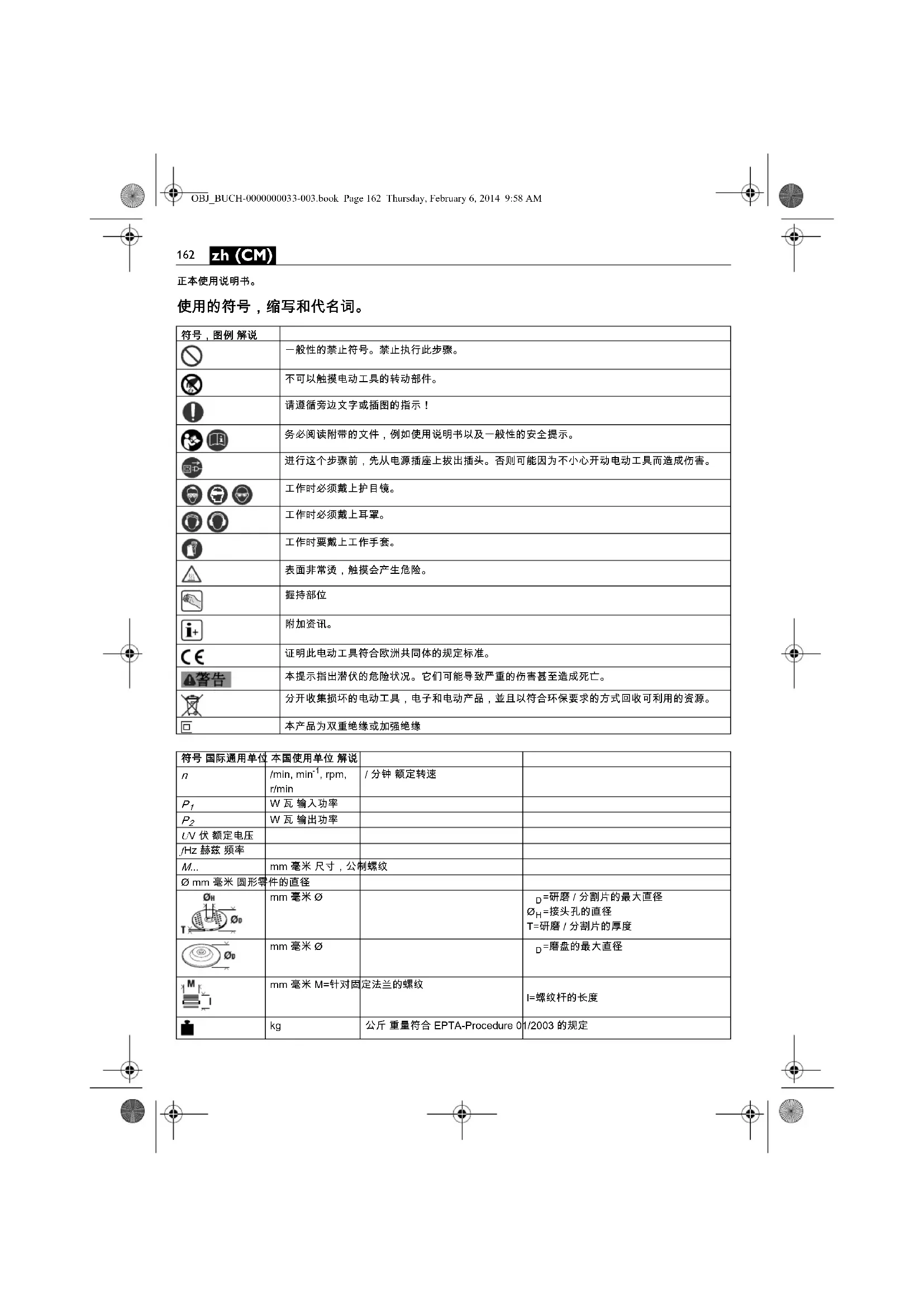 mm 毫米 M=针对固定法兰的螺纹 l=螺纹杆的长度 kg 公斤 重量符合 EPTA-Procedure 01/2003 的规定 OBJ_BUCH-0000000033-003.book Page 162 Thursday, February 6, 2014 9:58 AM163 zh (CM)