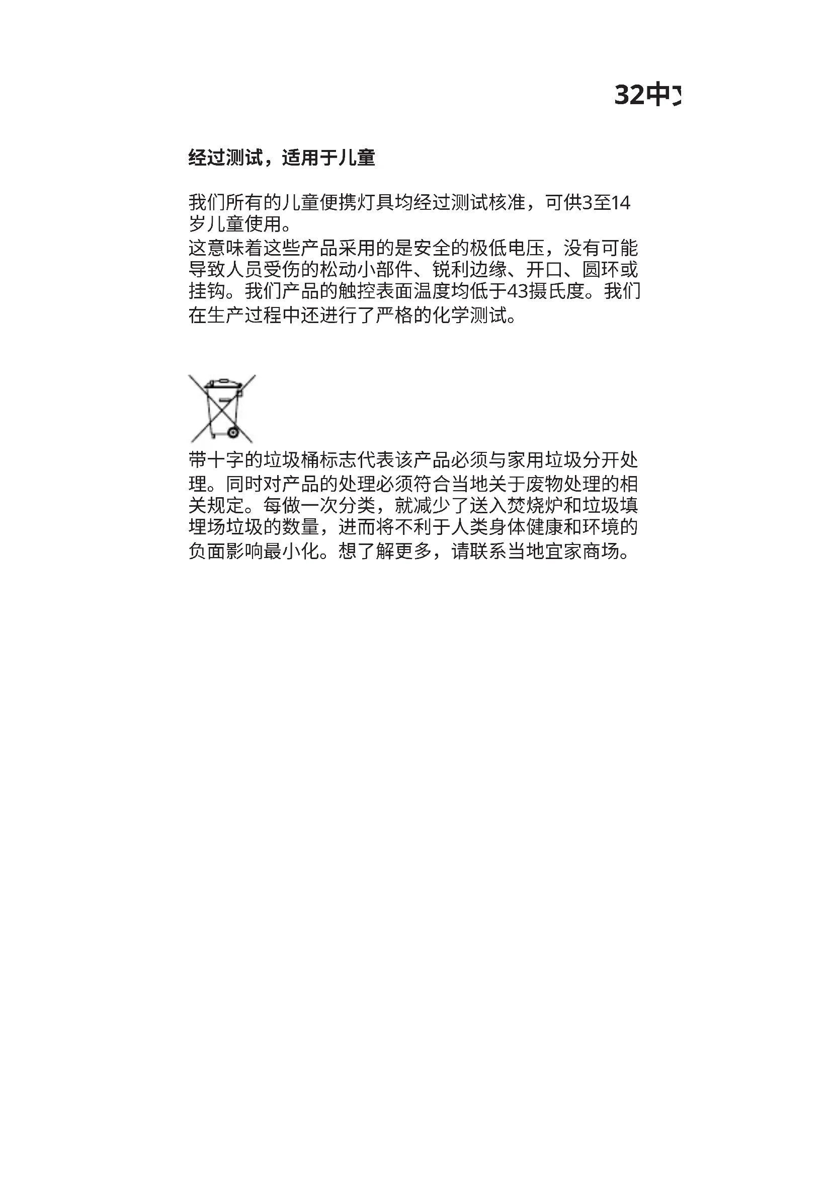 这意味着这些产品采用的是安全的极低电压,没有可能 导致人员受伤的松动小部件、锐利边缘、开口、圆环或 挂钩。我们产品的触控表面温度均低于43摄氏度。我们 在生产过程中还进行了严格的化学测试。 带十字的垃圾桶标志代表该产品必须与家用垃圾分开处 理。同时对产品的处理必须符合当地关于废物处理的相 关规定。每做一次分类,就减少了送入焚烧炉和垃圾填 埋场垃圾的数量,进而将不利于人类身体健康和环境的 负面影响最小化。想了解更多,请联系当地宜家商场。33繁中 經測試驗證適合兒童使用 所有IKEA手提式兒童燈具皆經過測試和驗證,適合3-14