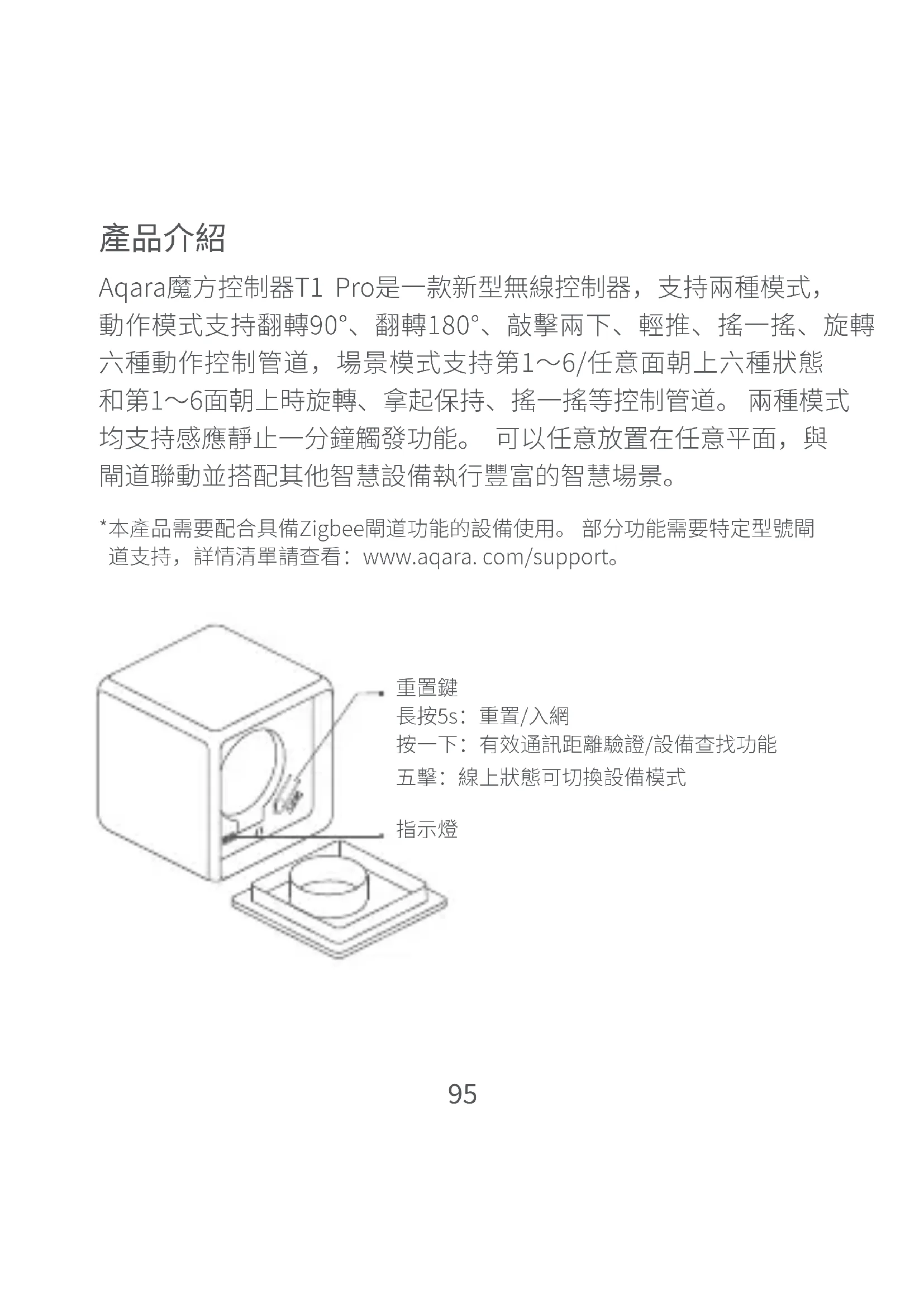 Aqara魔方控制器T1 Pro是一款新型無線控制器,支持兩種模式, 動作模式支持翻轉90°、翻轉180°、敲擊兩下、輕推、搖一搖、旋轉 六種動作控制管道,場景模式支持第1~6/任意面朝上六種狀態 和第1~6面朝上時旋轉、拿起保持、搖一搖等控制管道。 兩種模式 均支持感應靜止一分鐘觸發功能。 可以任意放置在任意平面,與 閘道聯動並搭配其他智慧設備執行豐富的智慧場景。 *本產品需要配合具備Zigbee閘道功能的設備使用。 部分功能需要特定型號閘 道支持,詳情清單請查看:www.aqara. com/support。