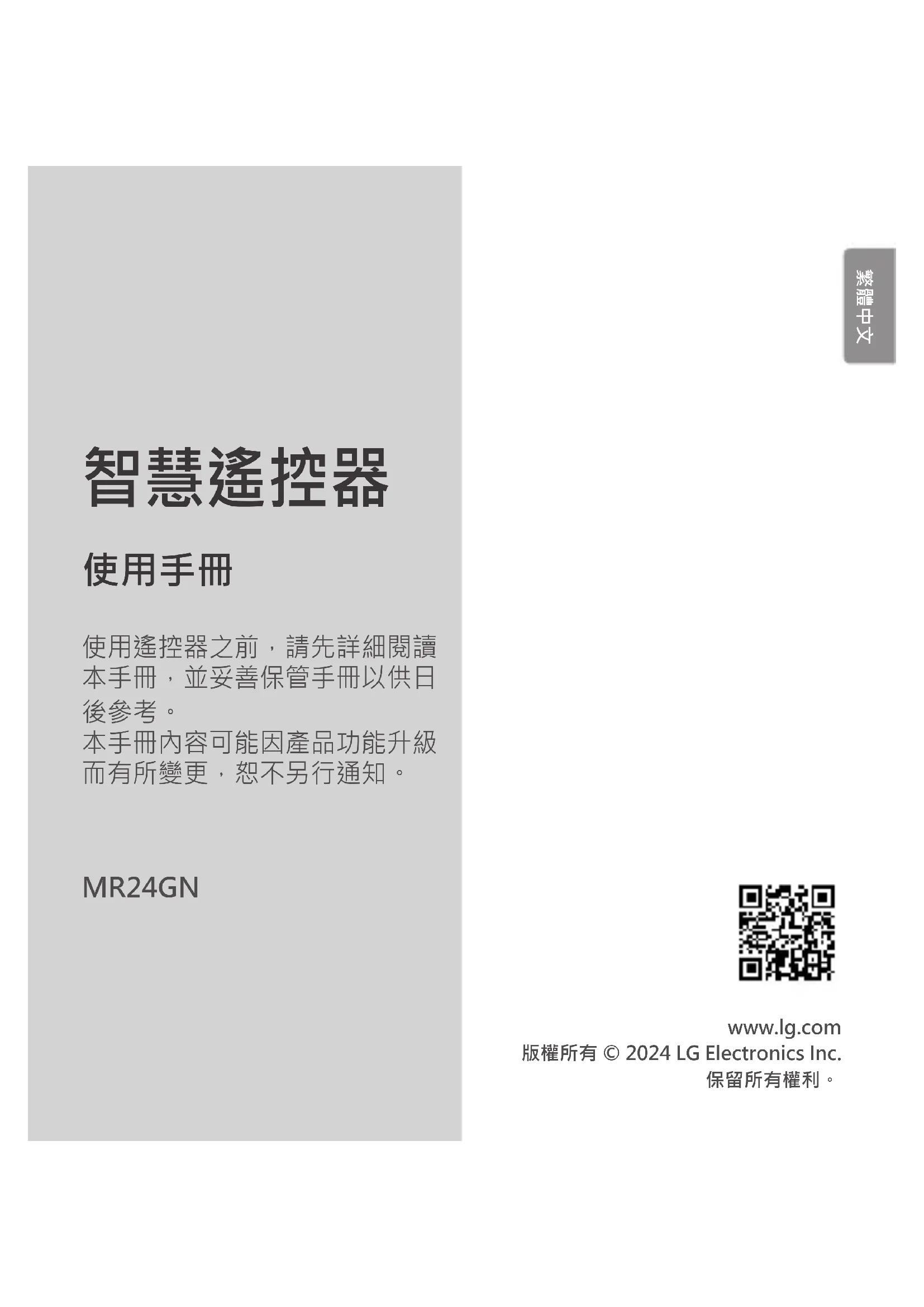 本手冊內容可能因產品功能升級 而有所變更,恕不另行通知。 MR24GN www.lg.com 版權所有 © 2024 LG Electronics Inc.