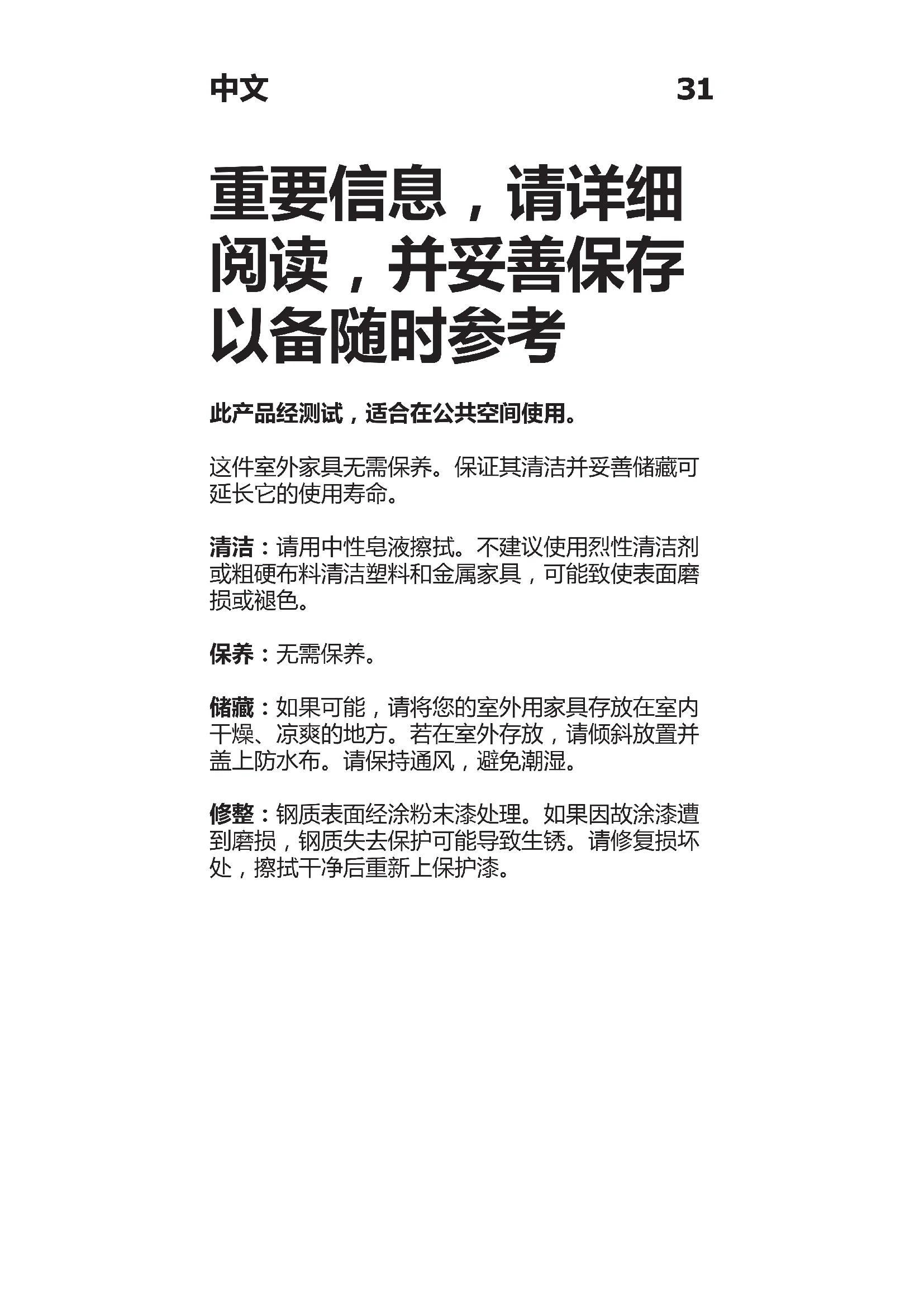 储藏:如果可能,请将您的室外用家具存放在室内 干燥、凉爽的地方。若在室外存放,请倾斜放置并 盖上防水布。请保持通风,避免潮湿。 修整:钢质表面经涂粉末漆处理。如果因故涂漆遭 到磨损,钢质失去保护可能导致生锈。请修复损坏 处,擦拭干净后重新上保护漆。
