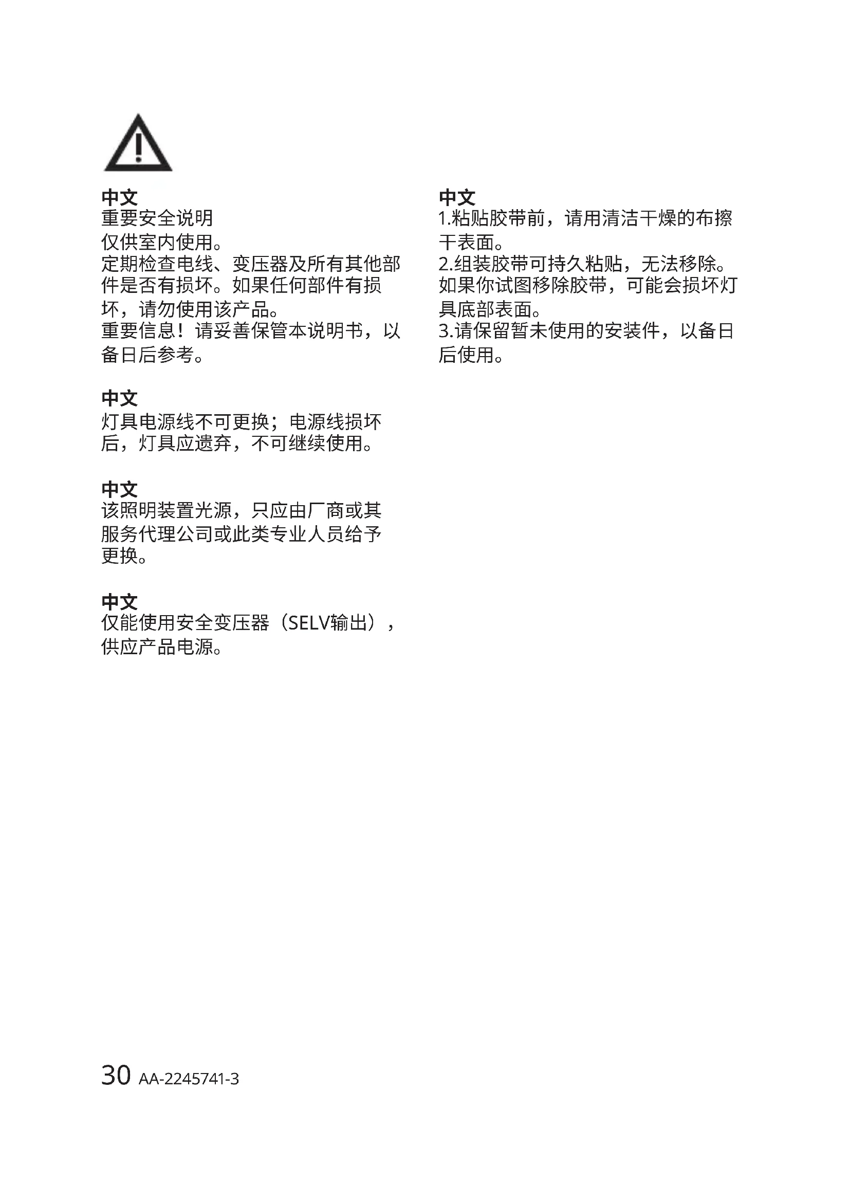 灯具电源线不可更换;电源线损坏 后,灯具应遗弃,不可继续使用。