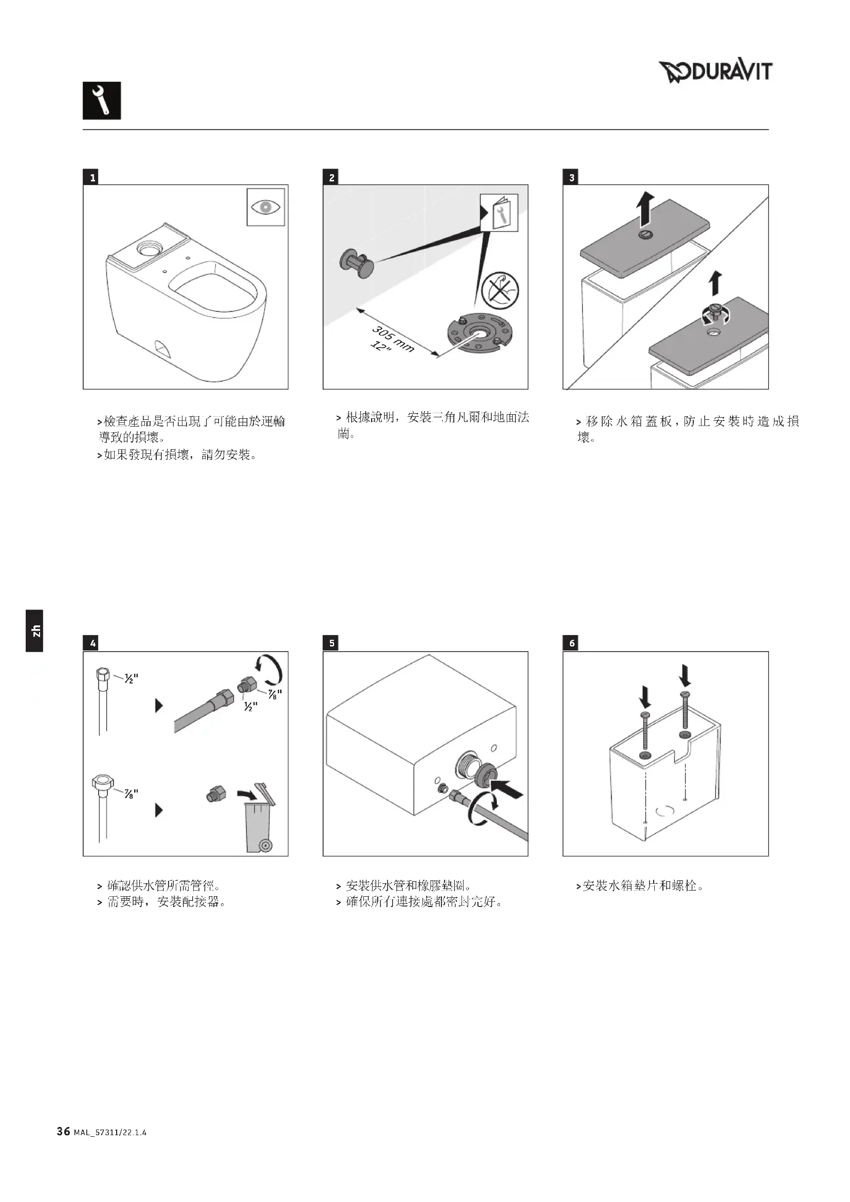 > 如果發現有損壞,請勿安裝。 > 移 除 水 箱 蓋 板 ,防 止 安 裝 時 造 成 損